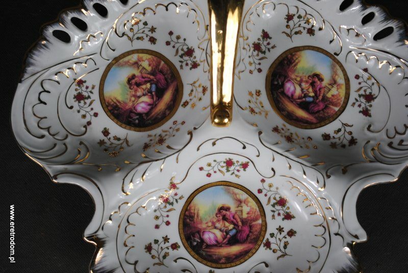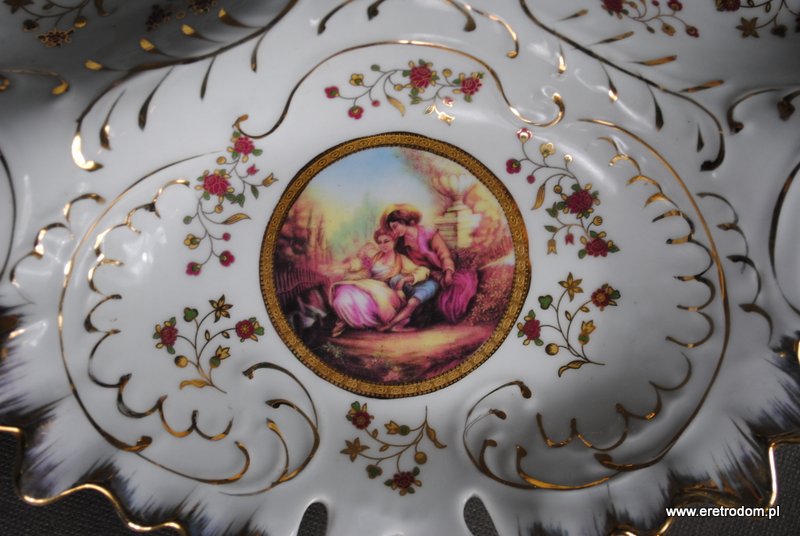 Strojny kabaret wykonany z porcelany. Zdobiony złotem oraz kalkomanią ze scenką wiedeńską. Całość prezentuje się bardzo ładnie.