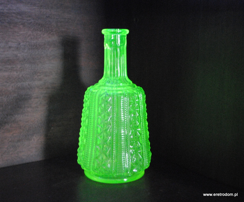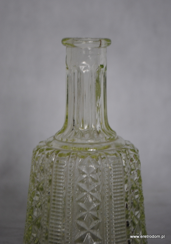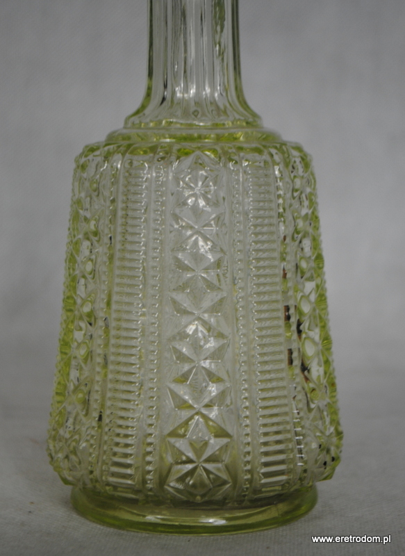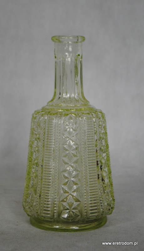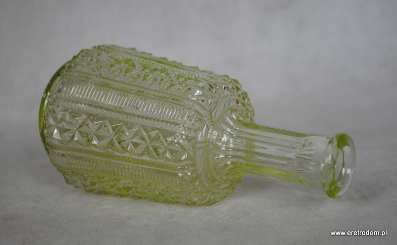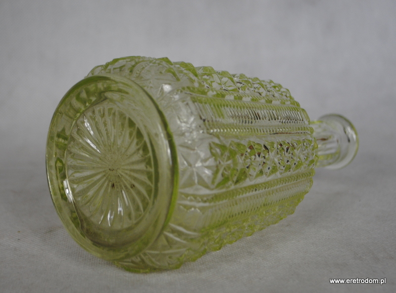 Karafka wyprodukowana w I poł. Xxw. Szkło prasowane, uranowe. Niestety brak korka.