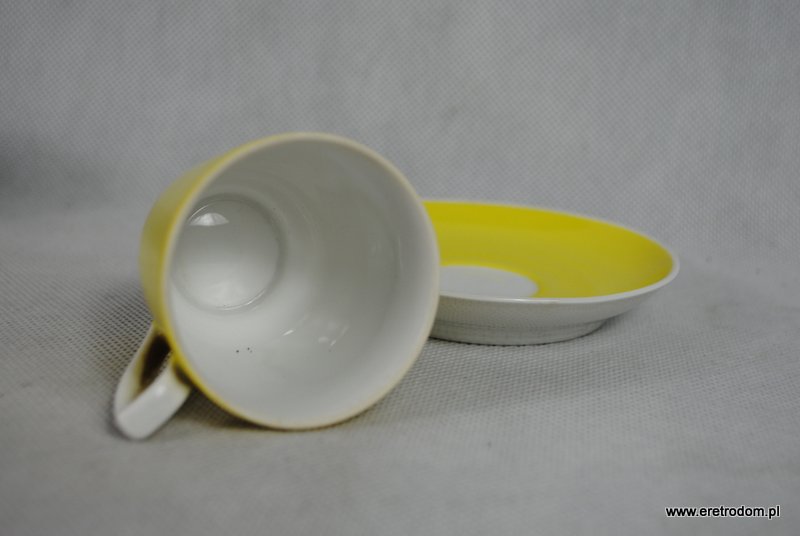 Filiżanka ze spodkiem sygnowana Karolina, lata 60 XXw. Mokka. Biała, delikatna porcelana malowana na piękny intensywny kolor. Nurt New Look.