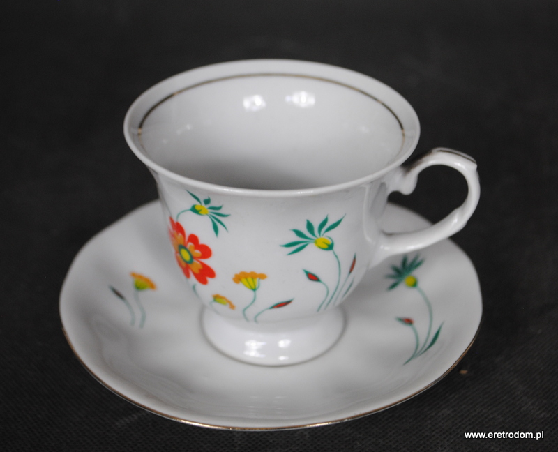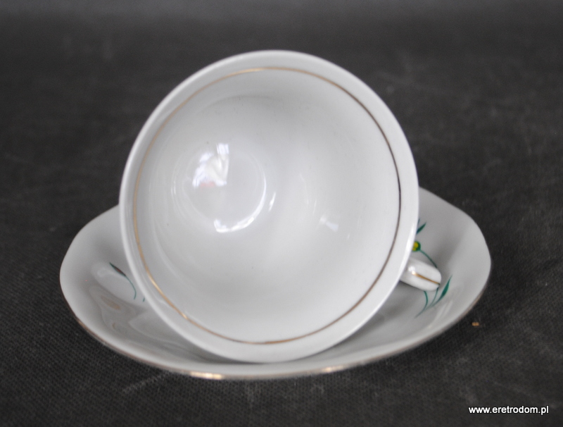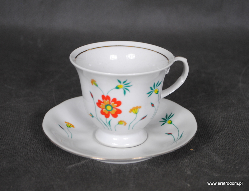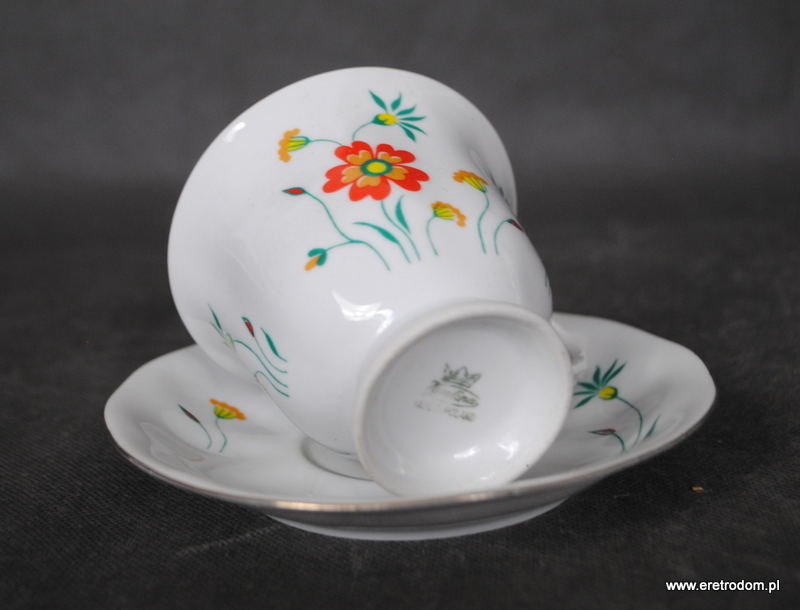 Filiżanka ze spodkiem z kwiatkiem sygnowana Karolina. II poł XXw. Biała porcelana ozdobiona kwiatową kalką.