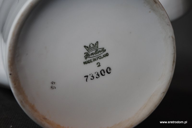 Dzbanek fason Milo. Sygnatura Karolina, lata 70 XXw. Projektant A. Sadulski. Biała porcelana zdobiona w stylu New Look.