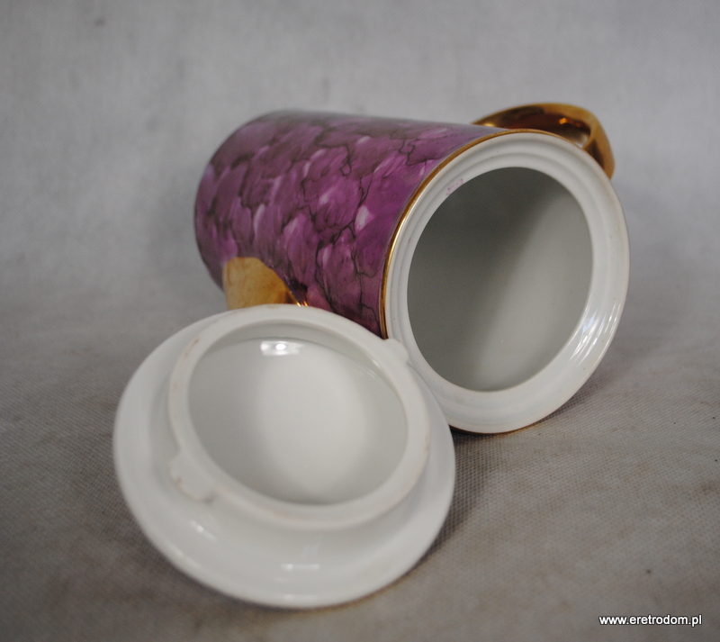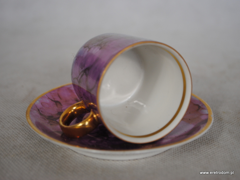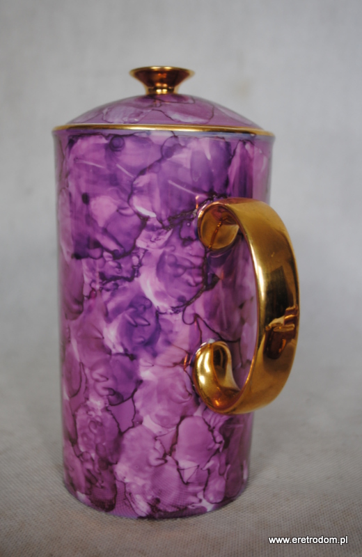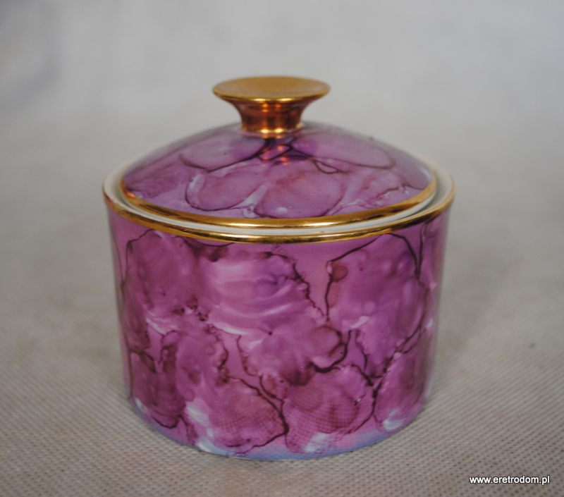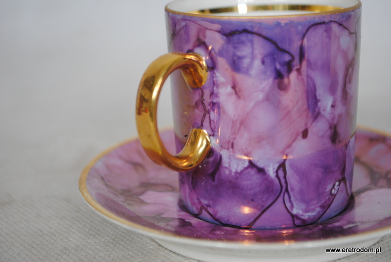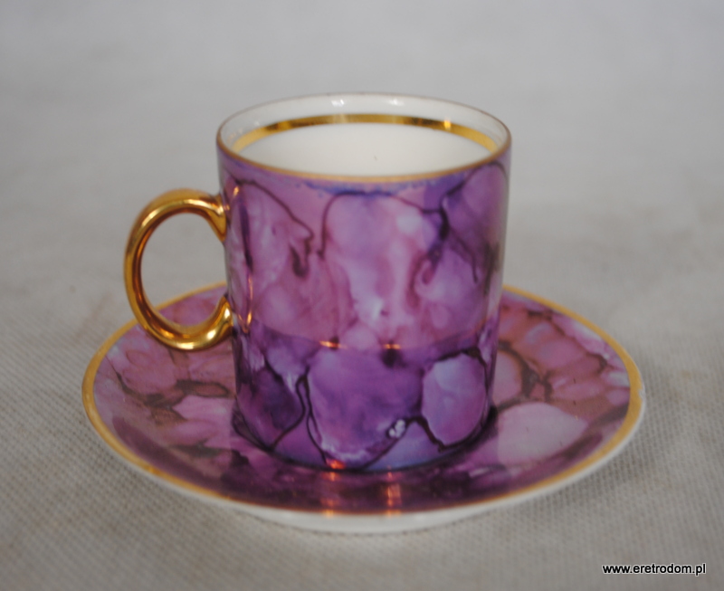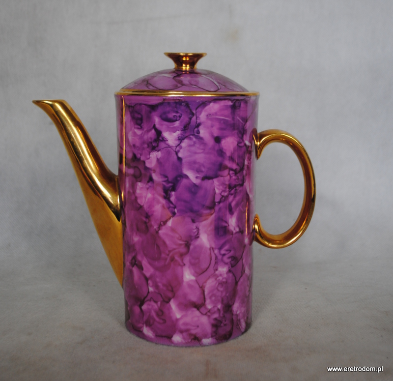 Serwis sygnowany Karolina. Fason Milo zaprojektowany przez Adama Sadulskiego. Biała porcelana ozdobiona marmurkiem w fuksjowym kolorze, złocona. Zestaw dla 6 osób.