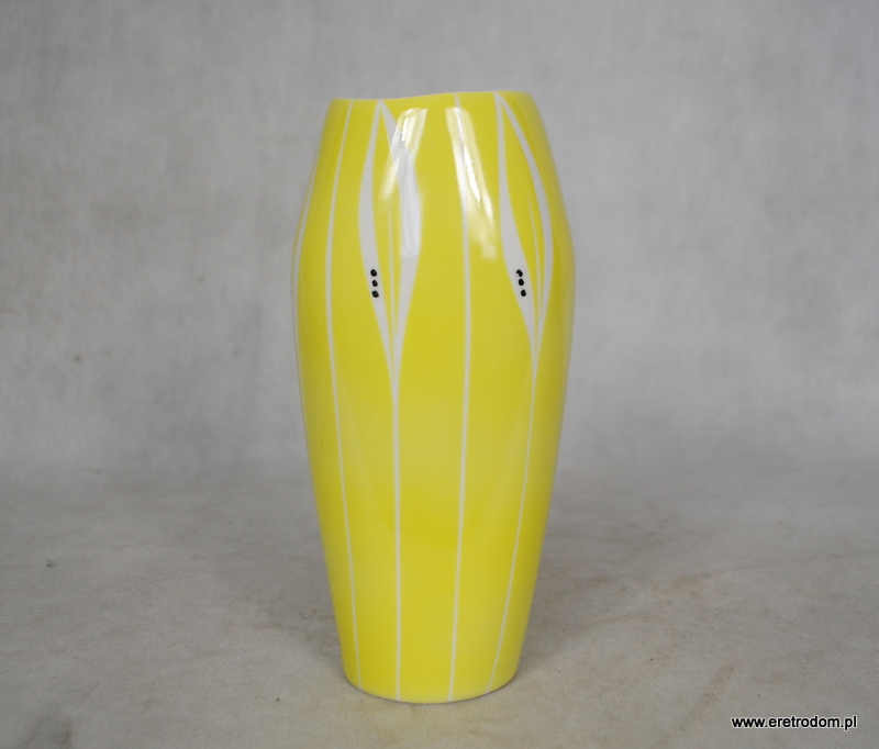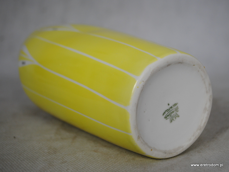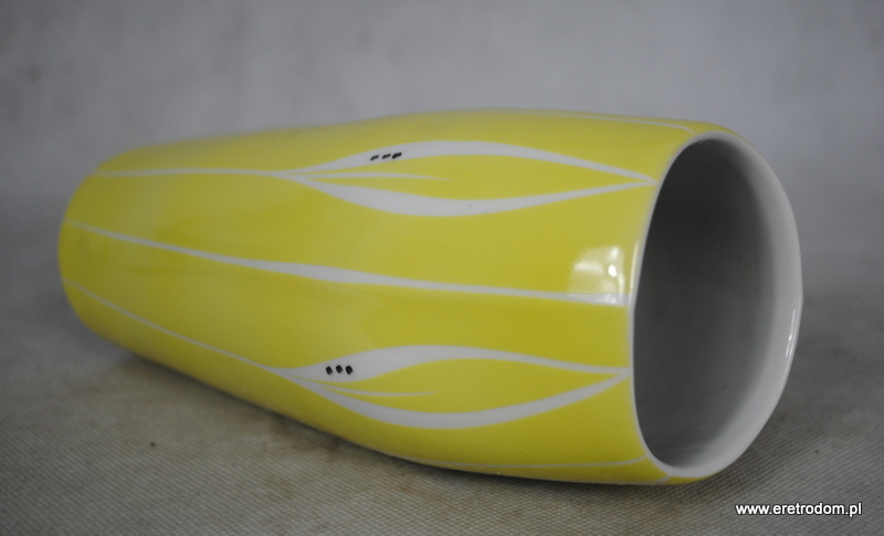 Wazon sygnowany Karolina, lata 60 XXw. Biała porcelana malowana natryskowo na ładny żółty kolor. Ozdobiona w stylu New Look.