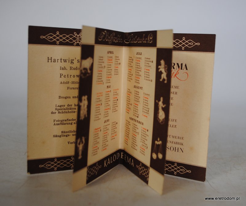 Kalendarz, Drogerie Hartwig’s, Katowice Piotrowice. 1941 rok.