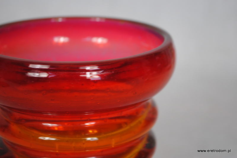 Wazon/świecznik, projekt Kazimierza Krawczyka z lat 60-70 XXw. Szkło sodowe, napowietrzone, ręcznie formowane. Barwione w masie na kolor czerwony, żółty, w środku mleczny.