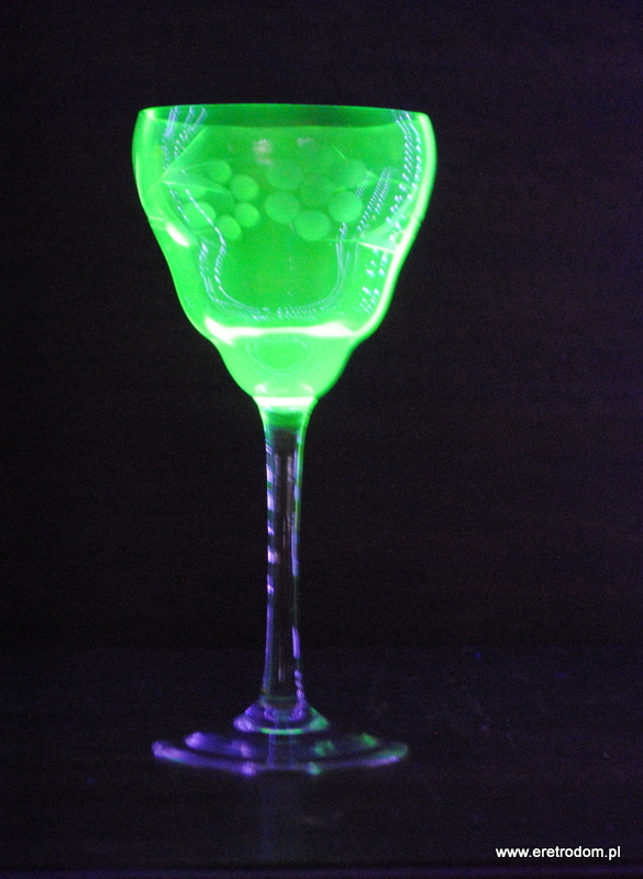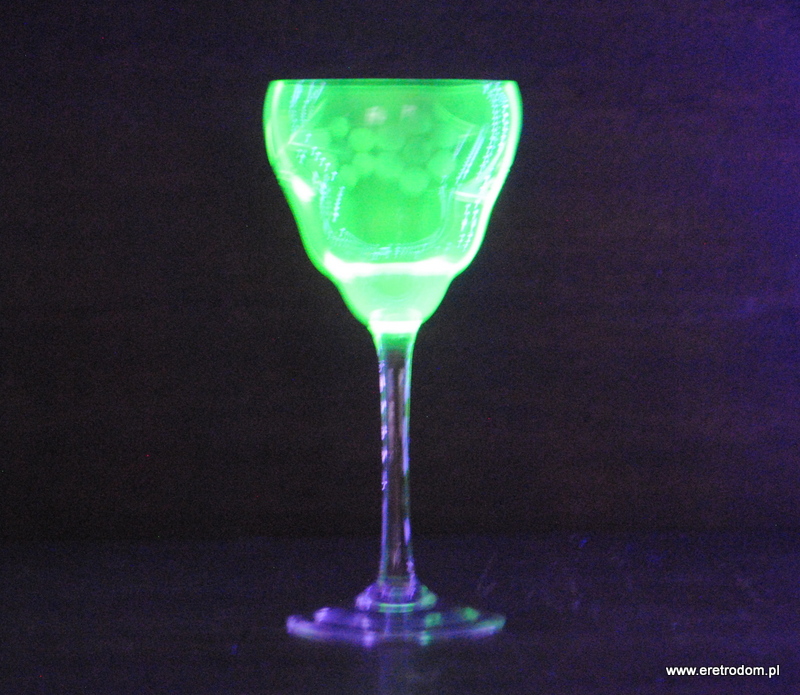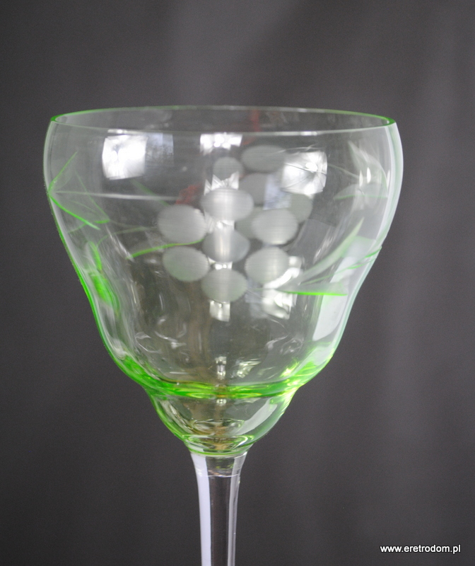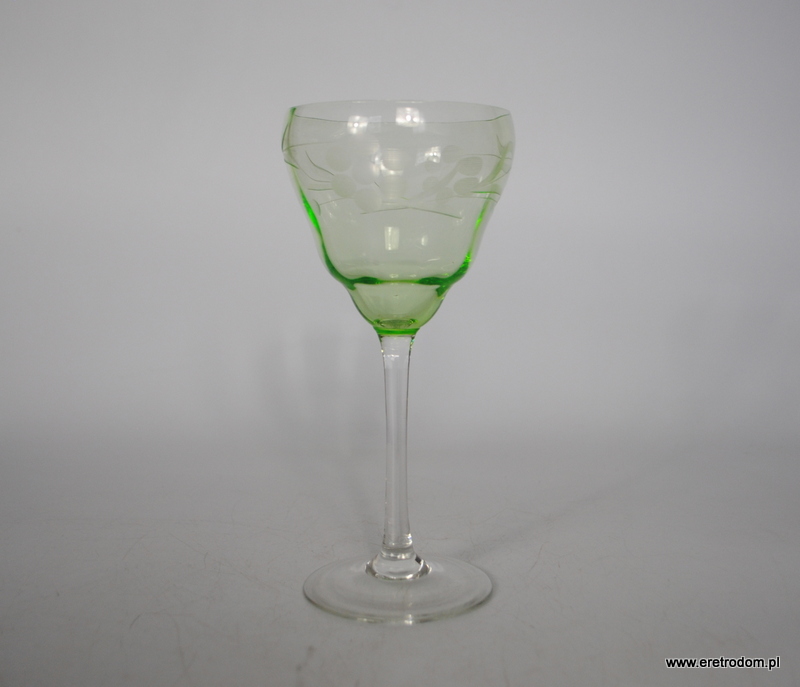 Kieliszek do wina. I pol. XXw. Delikatne szkło uranowe. Na czaszy zdobienie.