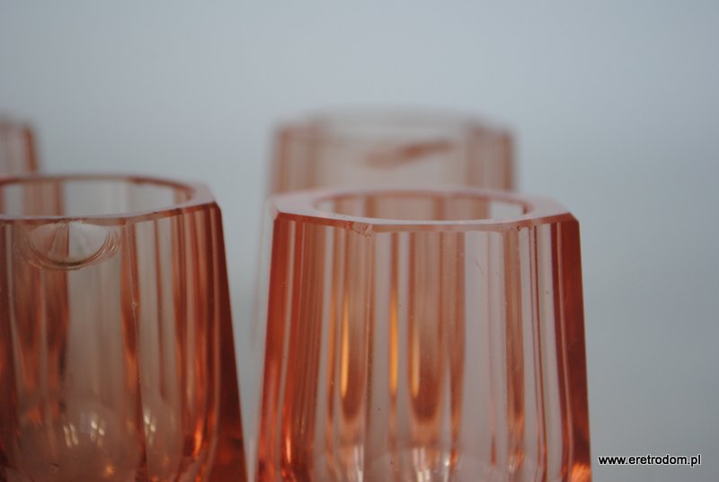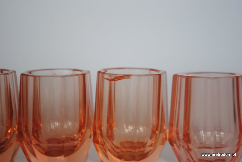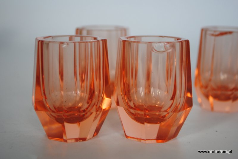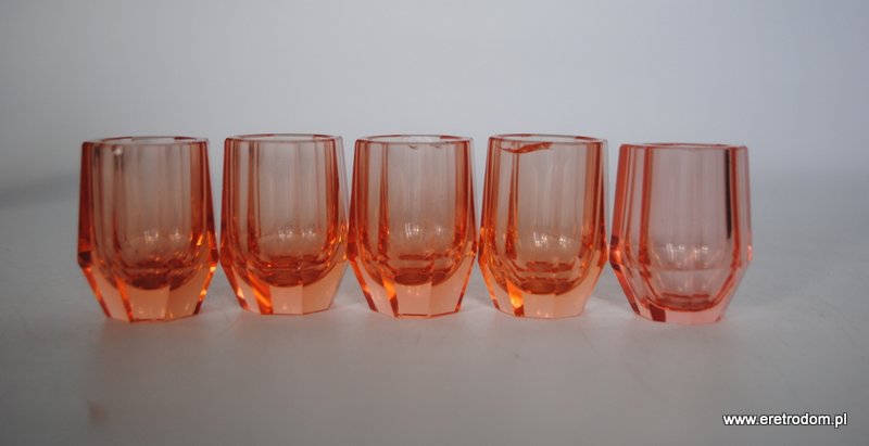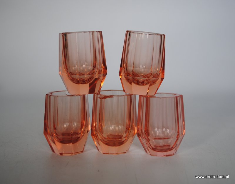 Zestaw 5 kieliszków, I poł. XXw. Dość grube szkło barwione w masie. Kolor łososiowy.