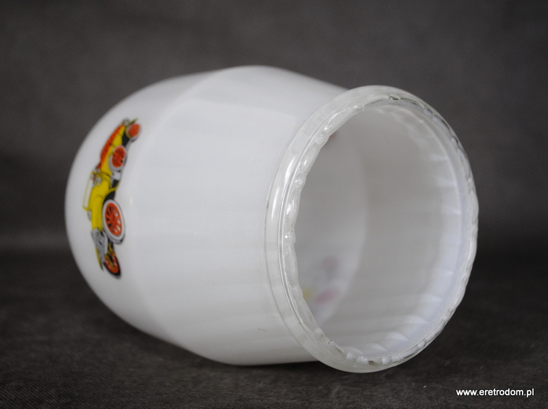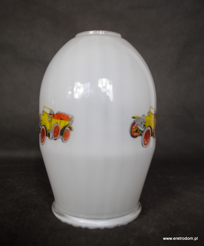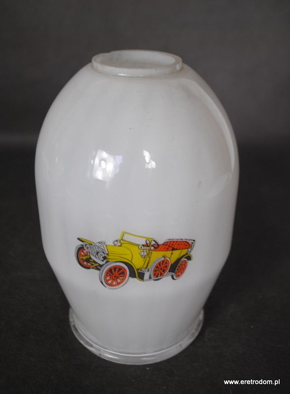 Szklany klosz, Polska, II poł. XXw. Białe szkło ozdobione motywem samochodów. Idealny na kinkiet lub żyrandol.