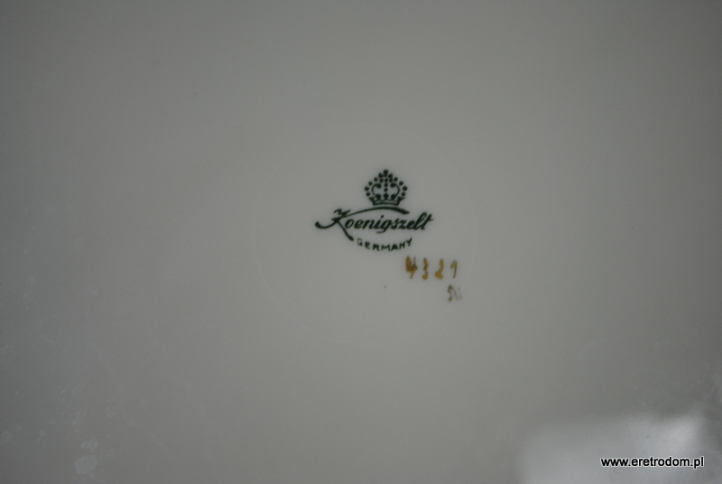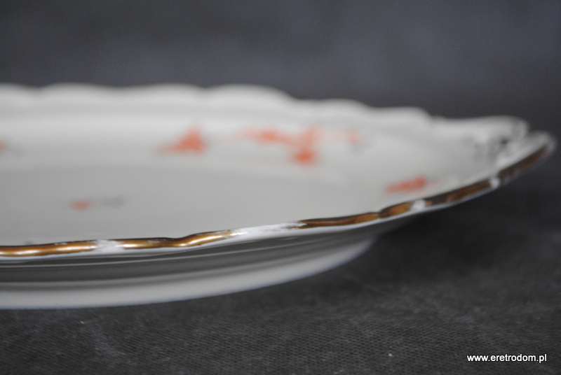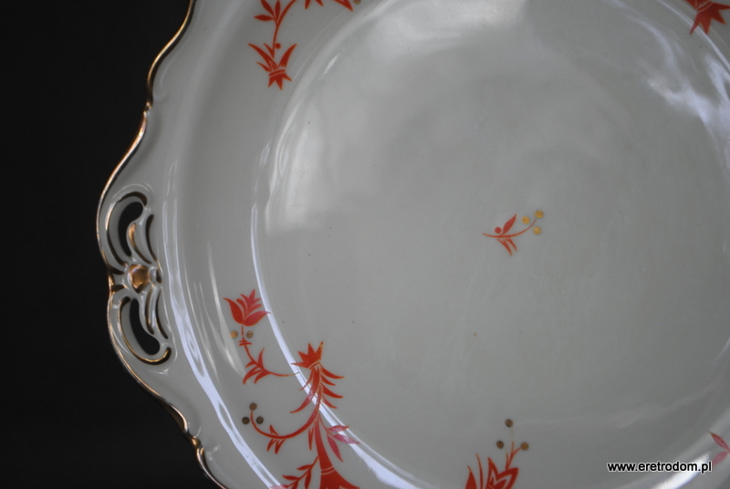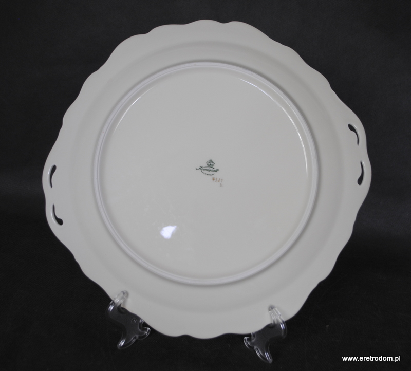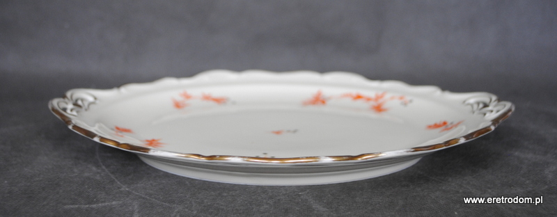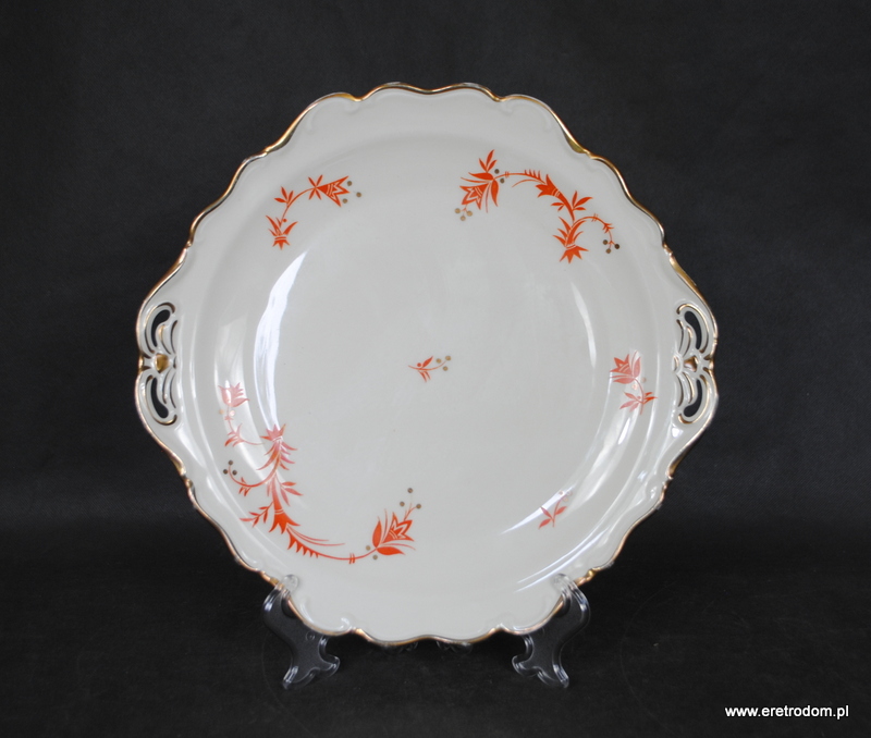 Patera sygnowana Koenigszelt (Jaworzyna Śląska, lata 30 XXw.). Porcelana w kolorze ecru ozdobiona motywem kwiatowym. Rant złocony. Po bokach strojne uszy.