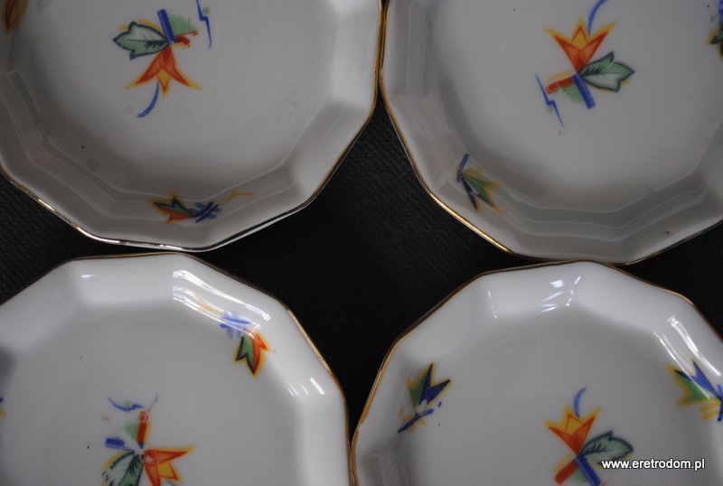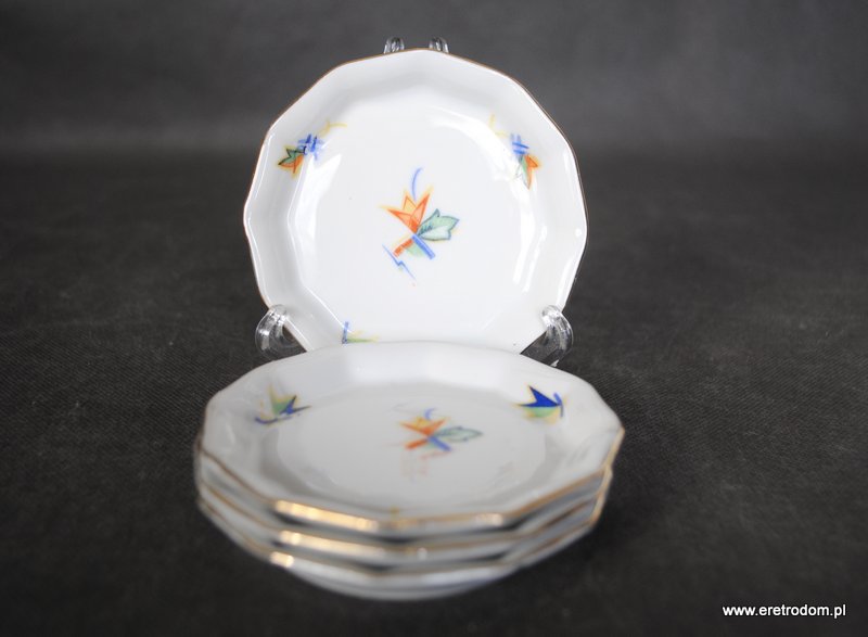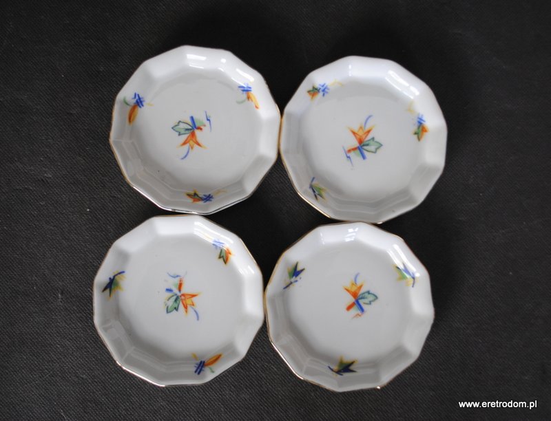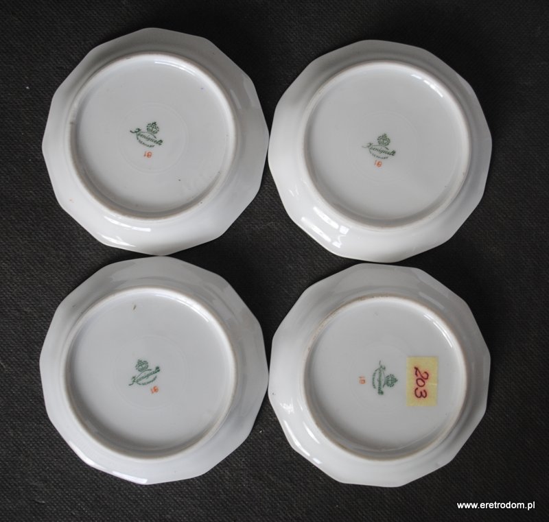 Talerzyki na marmoladę ( 4 sztuki). Koenigszelt (Jaworzyna Śląska), I poł. XXw. Delikatna porcelana ozdobiona kalką, rant złocony.