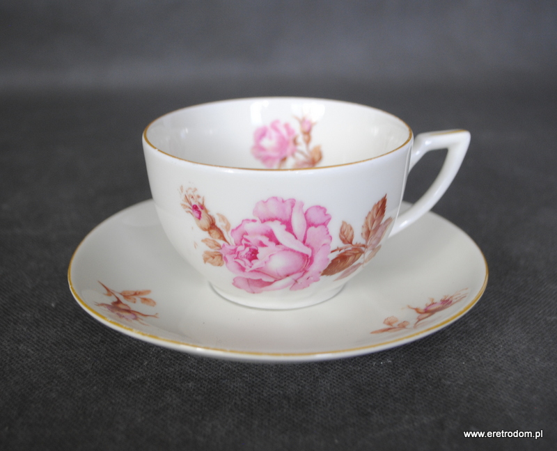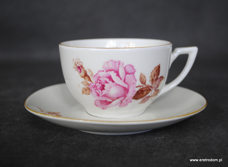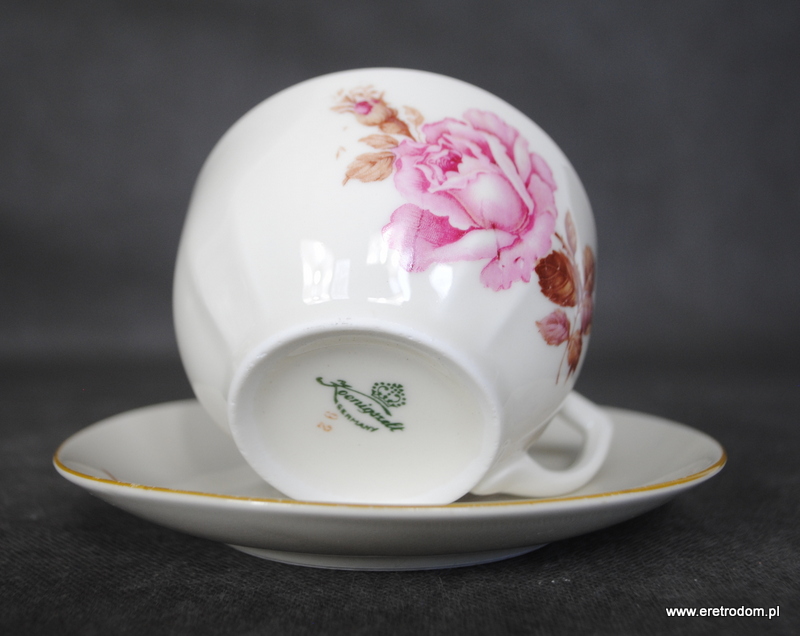 Filiżanka ze spodkiem, Koenigszelt (stara Jaworzyna Śląska). I poł. XXw. Porcelana w kolorze złamanej bieli ozdobiona kalką.