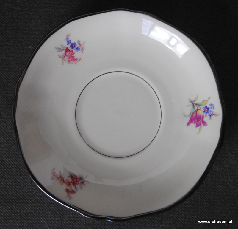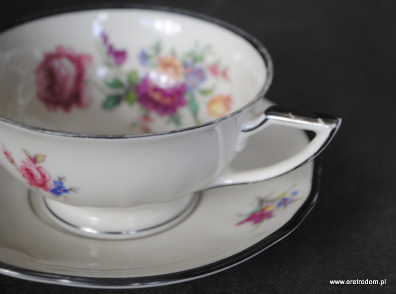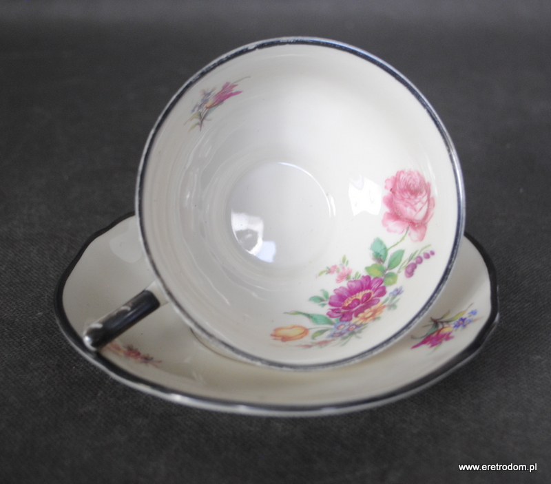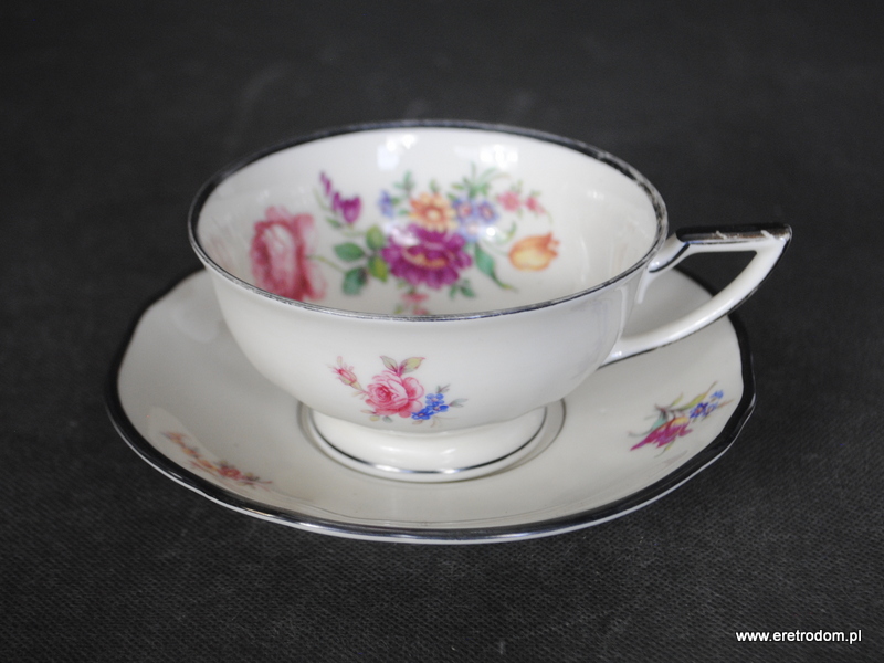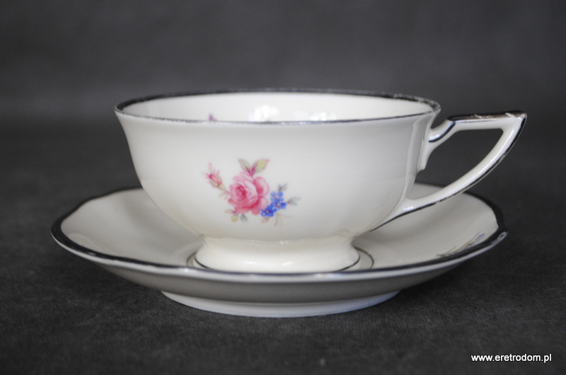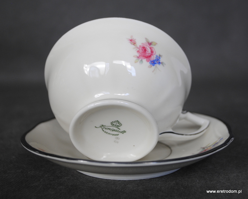 Filiżanka ze spodkiem, Koenigszelt (stara Jaworzyna Śląska). I poł. XXw. Porcelana w kolorze złamanej bieli, rant srebrzony, kalka kwiatowa.