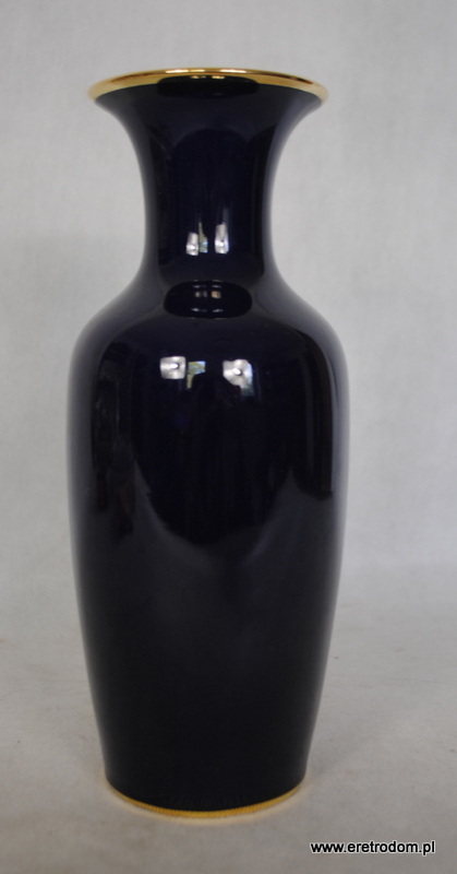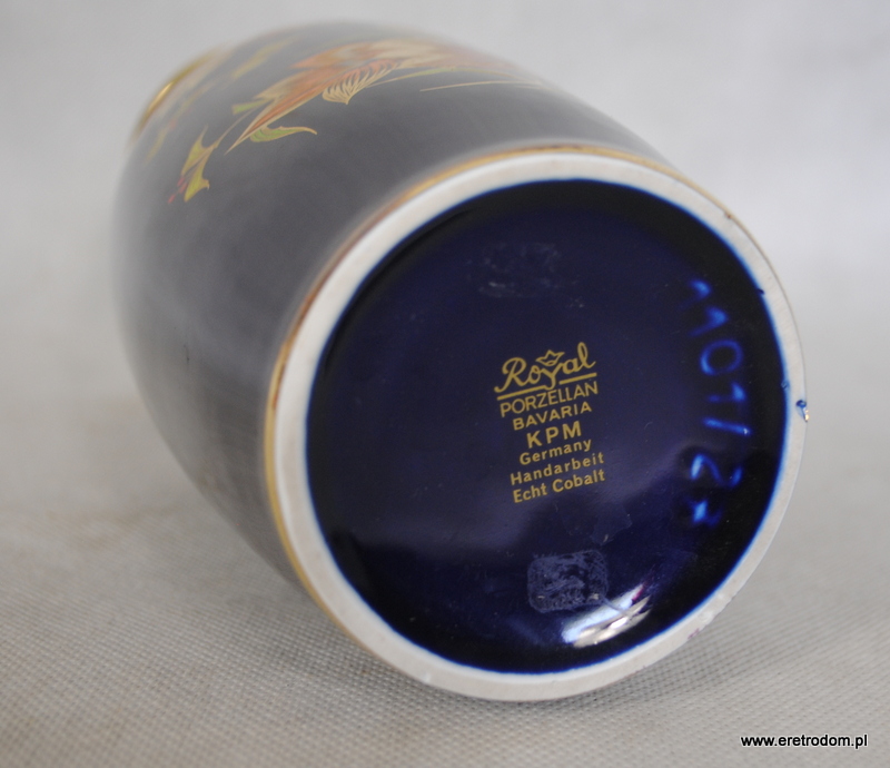 Wazon sygnowany KPM Germany Royal Porzellan (Niemcy, Bavaria). Biała porcelana malowana na kobaltowy kolor, ozdobiona motywem liści.