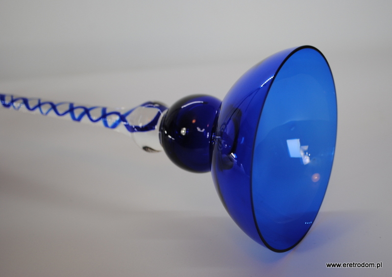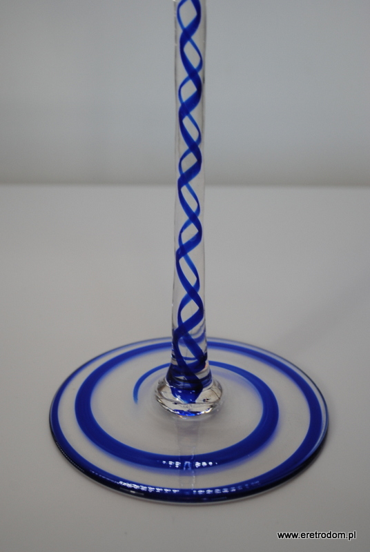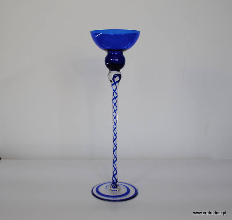 Świecznik wyprodukowany w Hucie Szkła Józefina (Krosno). Szkło sodowe, ręcznie formowane, częściowo barwione w masie na niebieski kolor.