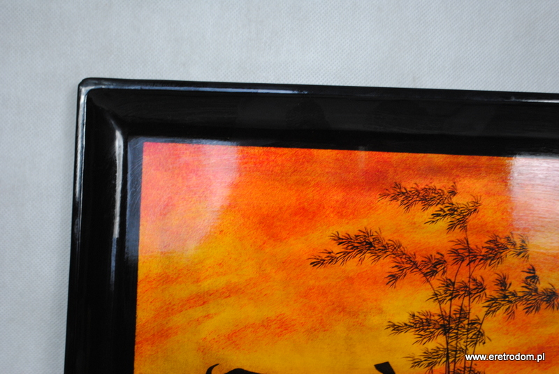 Taca wykonana z laki. Forma prostokąta ozdobiona motywami orientalnymi.