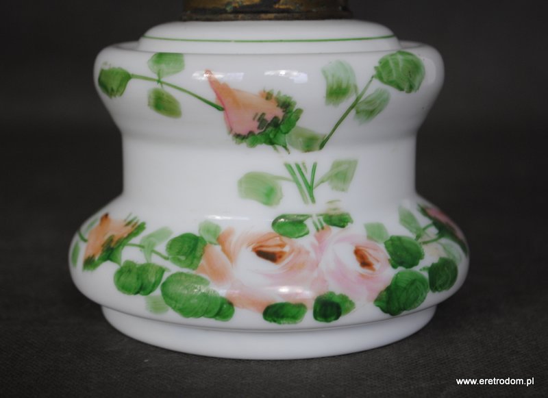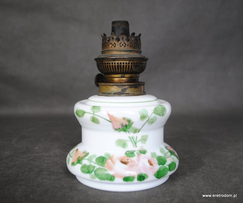 Urocza lampka naftowa. Korpus wykonany ze szkła, ręcznie malowane kwiaty. Elementy mosiężne wykonane przez firmę Kosmos Brenner.