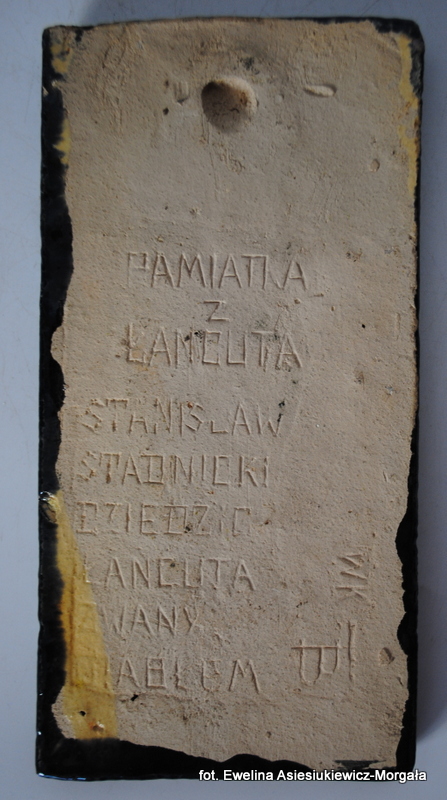 Plakieta pamiątkowa. Wykonana z ceramiki na pamiątkę pobytu w Łańcucie. W tylnej części posiada przypis „Pamiątka z Łańcuta. Stanisław Stadnicki dziedzic Łańcuta zwany diabłem”. II poł. XXw. Sygnowana WK.