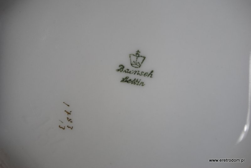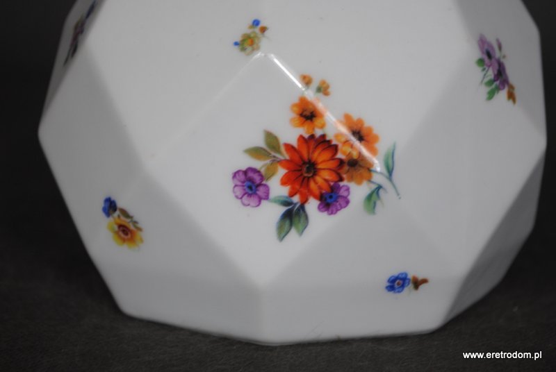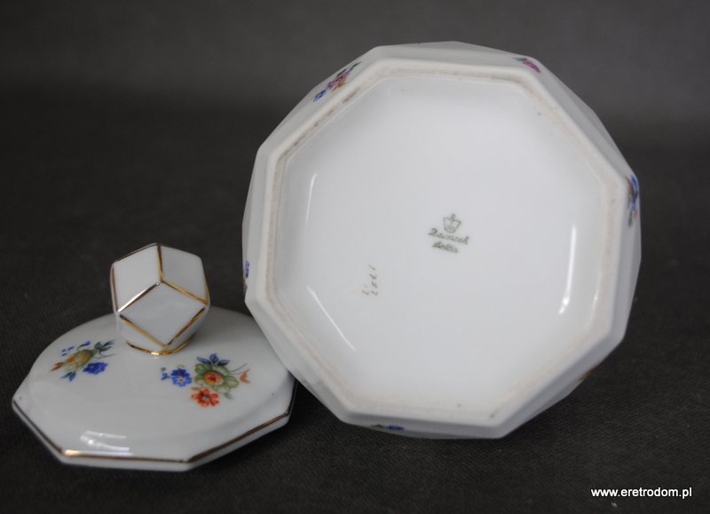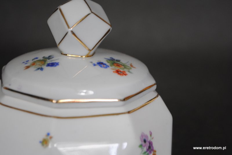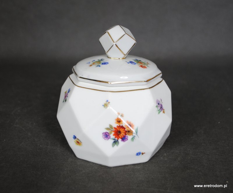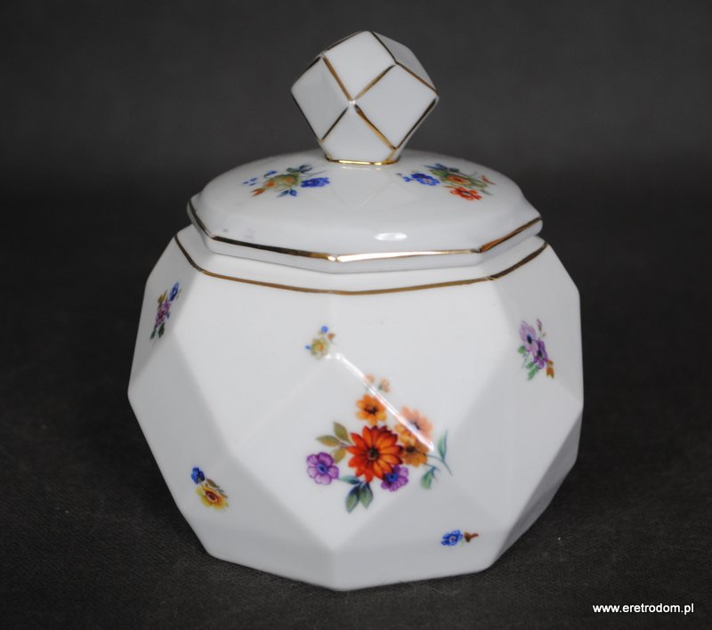 Bombonierka wyprodukowana przez manufakturę Lettin (Niemcy) w latach 1927-1945. Biała, dość delikatna porcelana o intrygującej formie. Ozdobiona motywem kwiatowym, złocona.
