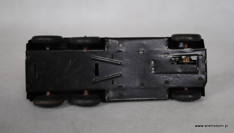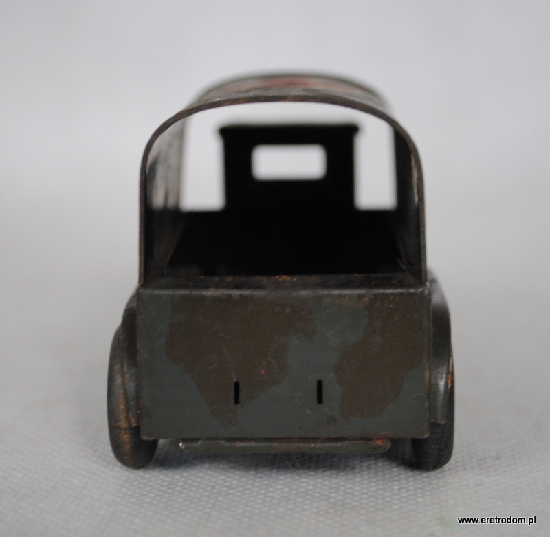 Zabawka karetka najprawdopodobniej wyprodukowana przez firmę Lineol Germany (?). Niemcy, lata 20 XXw. Wykonana z metalu. Nakręcana na kluczyk, kluczyka brak.