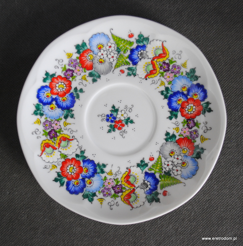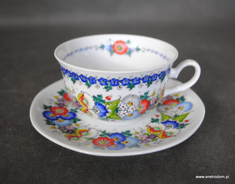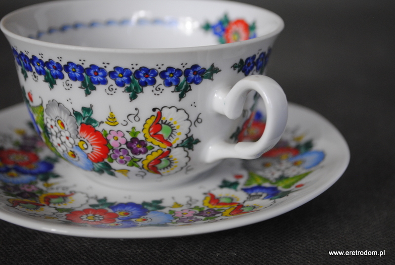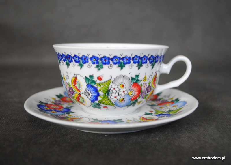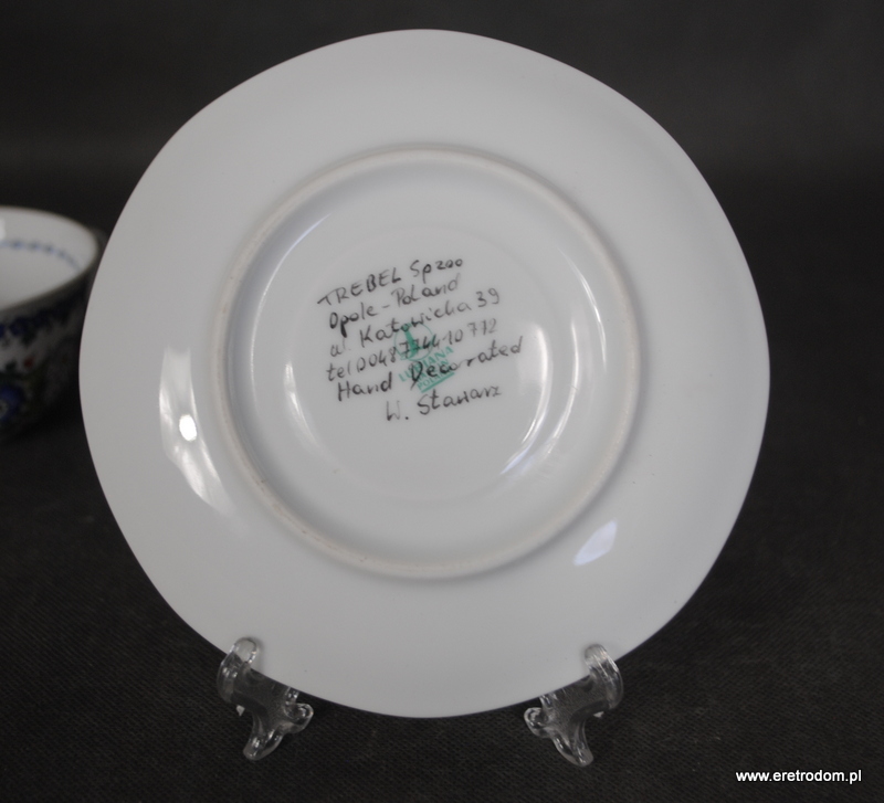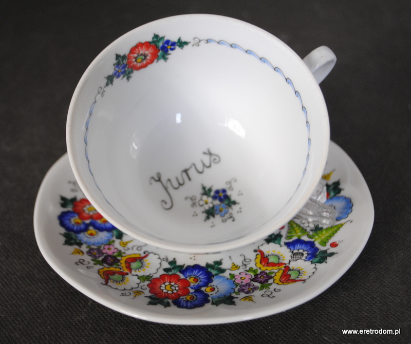Okazjonalna filiżanka ze spodkiem, Lubiana, II poł. XXw. Biała porcelana ręcznie malowana w Opolskiej malarni. Na dnie napis „Juruś”.