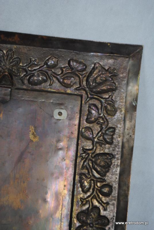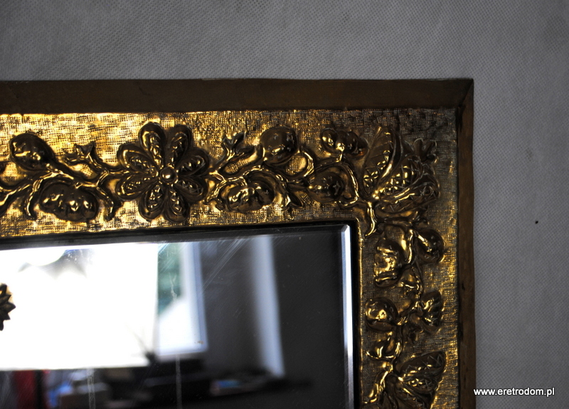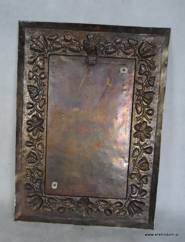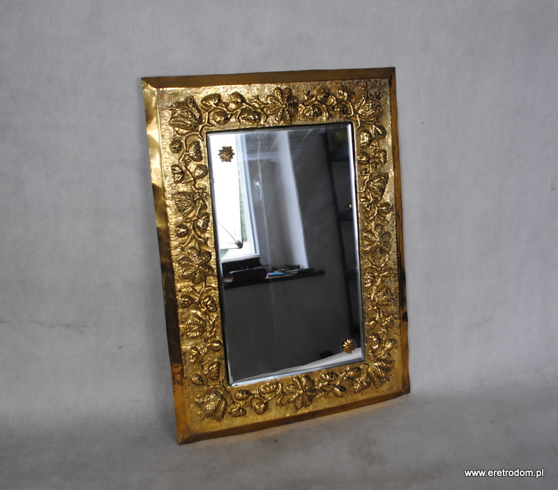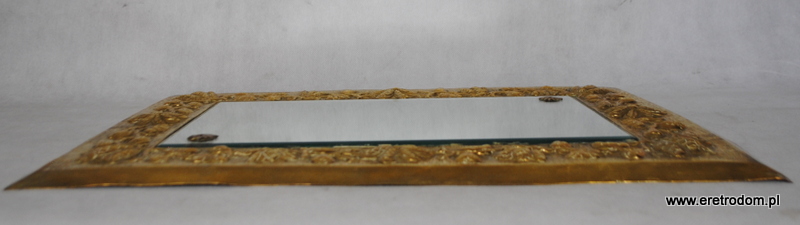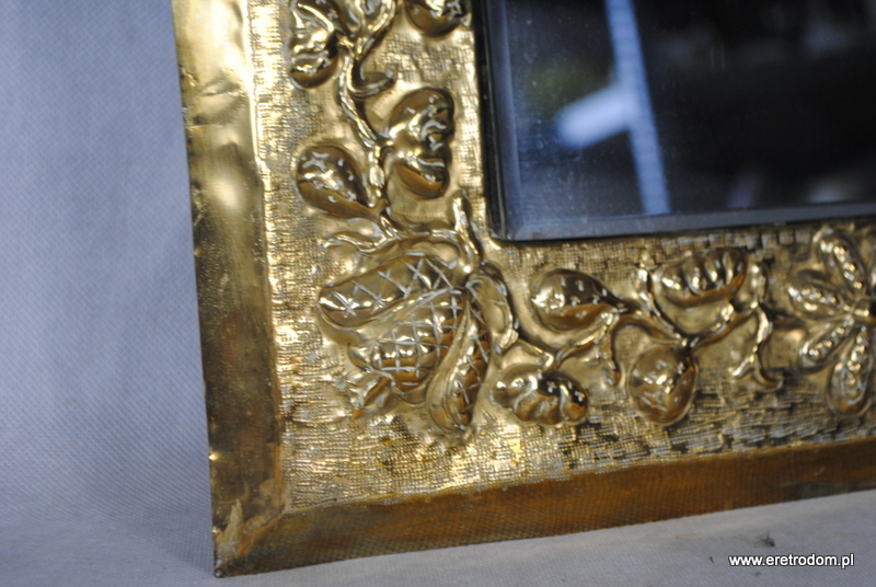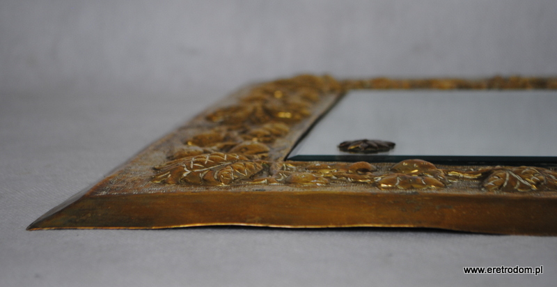 Lustro w ramie wykonanej z tłoczonego mosiądzu. Rama bogato zdobiona motywami roślinnymi. Tafla szkła ozdobiona dodatkowo dwoma kwiatami wykonanymi z mosiądzu.
