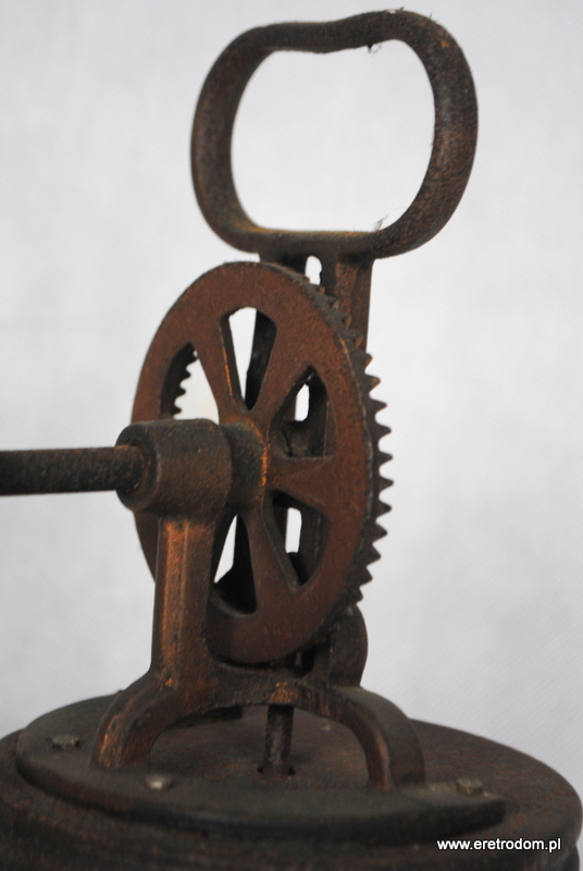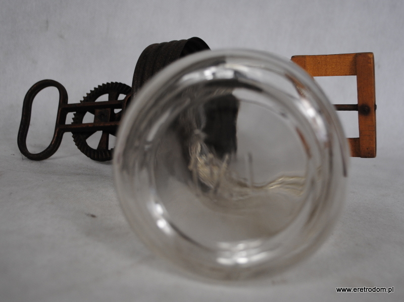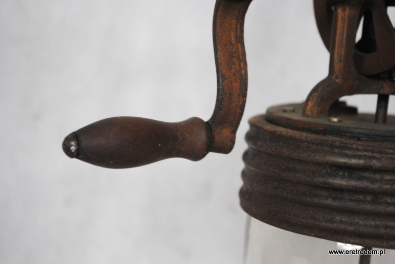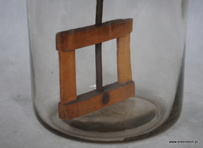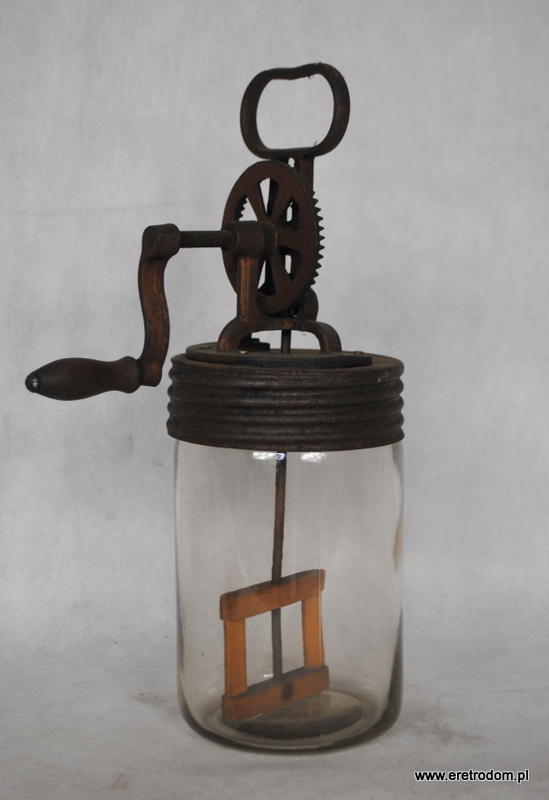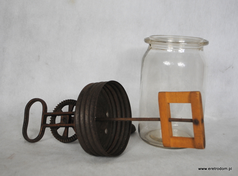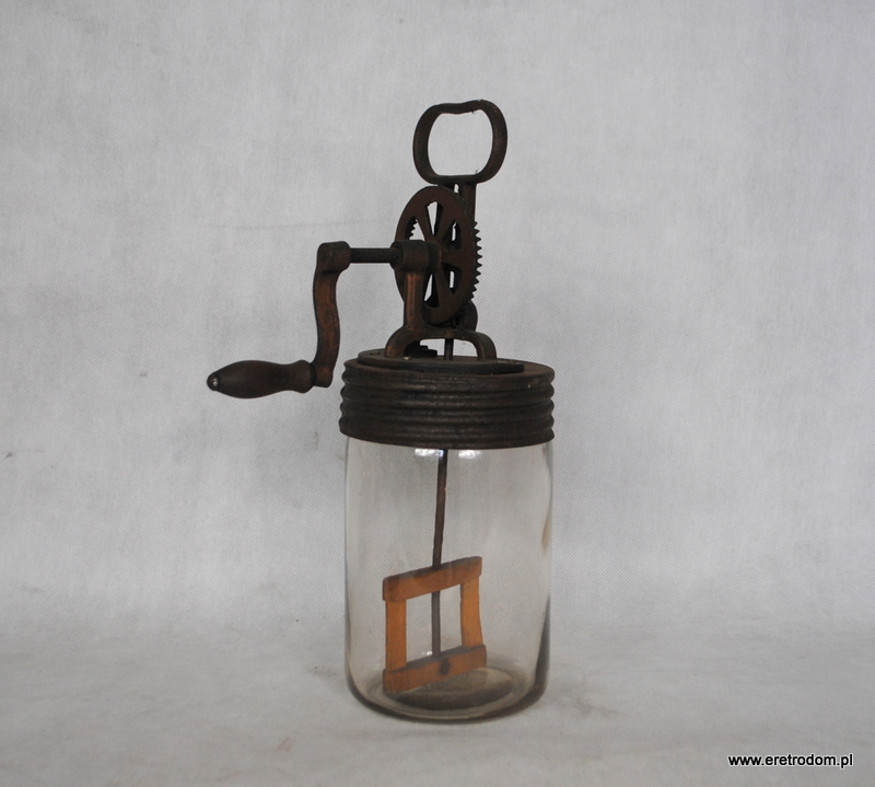 Ręczna ubijaczka do masła. Słoik wykonany ze szkła, napęd metalowy, rączka drewniana.