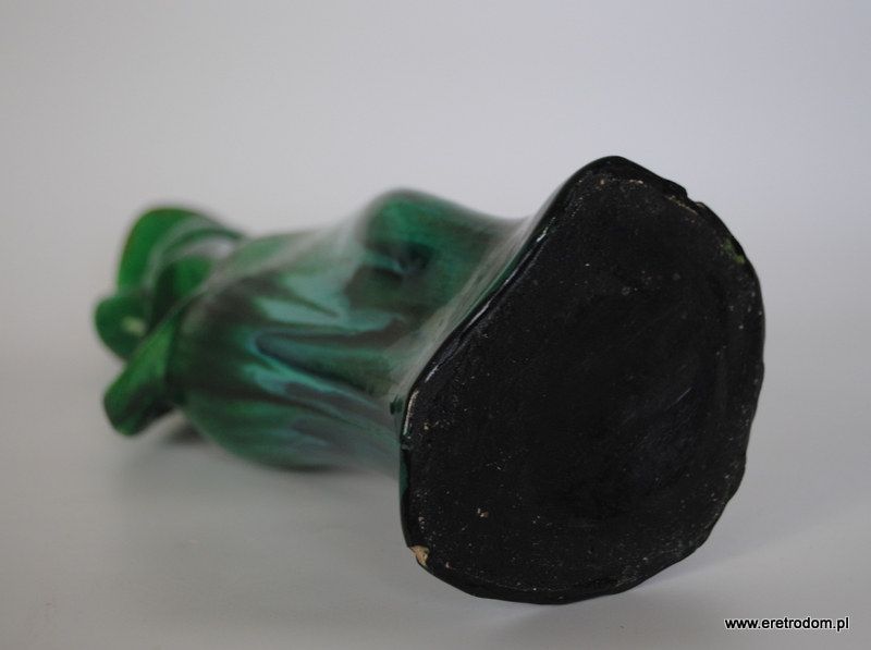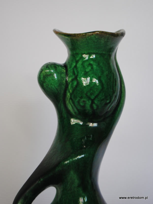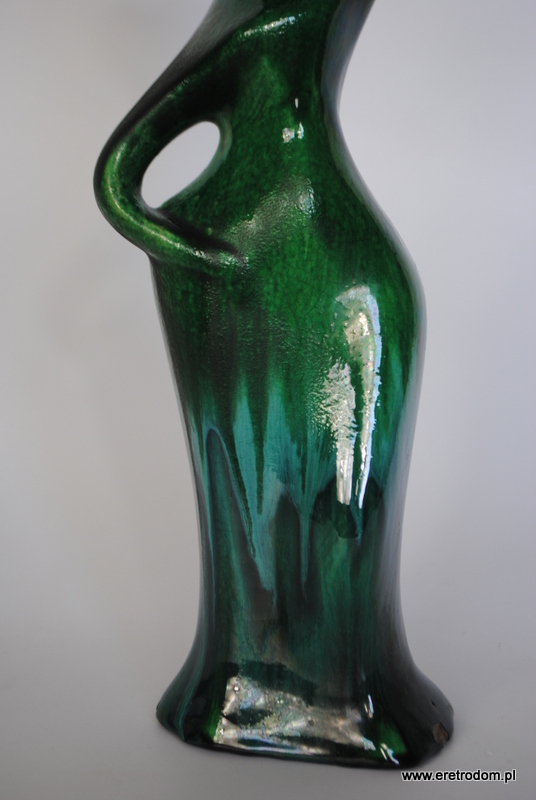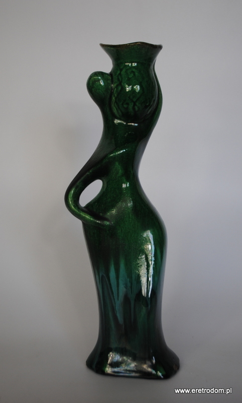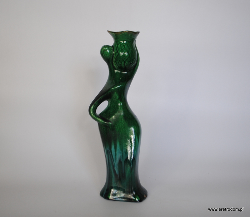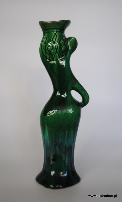 Świecznik figuralny „Kobieta z dzbanem” proj. Dionizy Strzelbicki, Ceramika Krakowska (II poł. XXw.). Ciekawa forma kobiety z koszem, ładne, zielone szkliwienie.