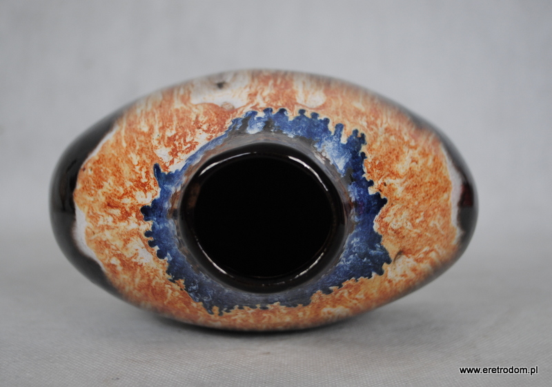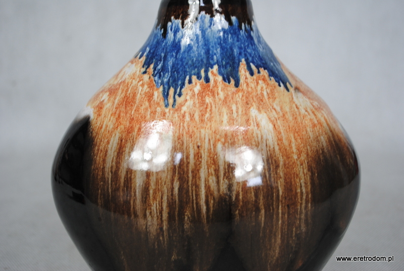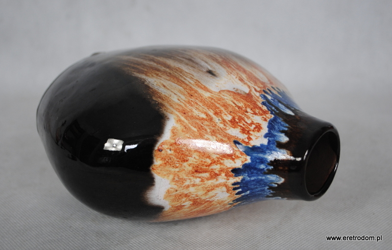 Wazon wyprodukowany w krakowskiej manufakturze Millenium. Lata 60-70 XXw. Ceramika szkliwiona w typowy dla wytwórni sposób. Spód malowany na czarno.