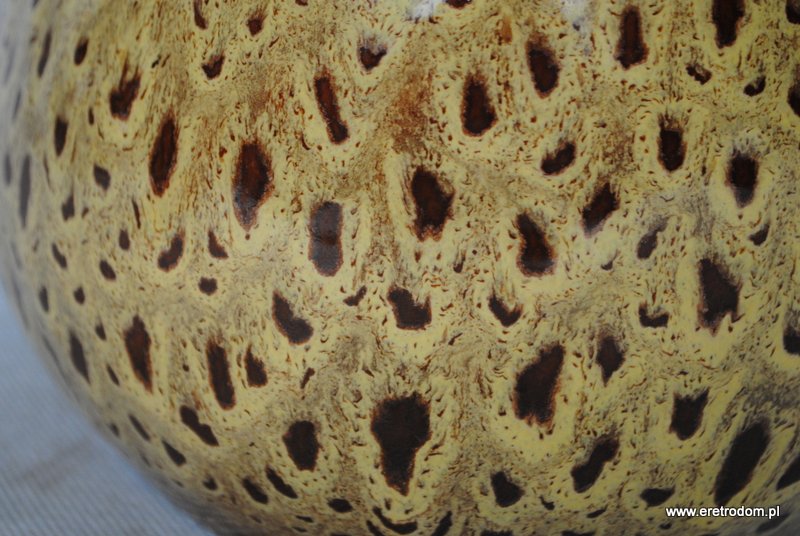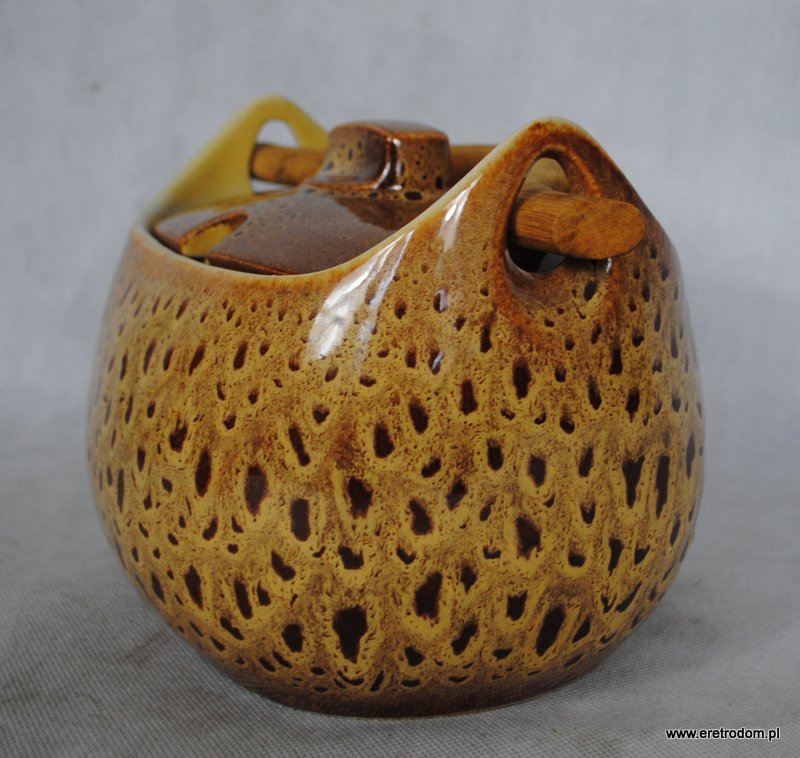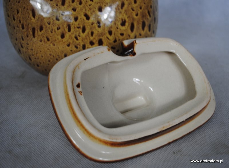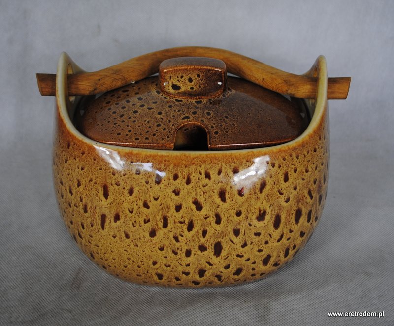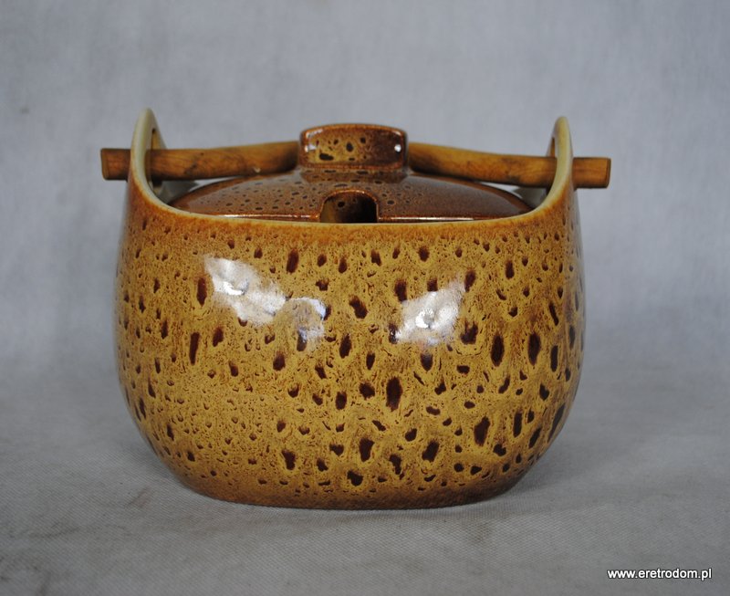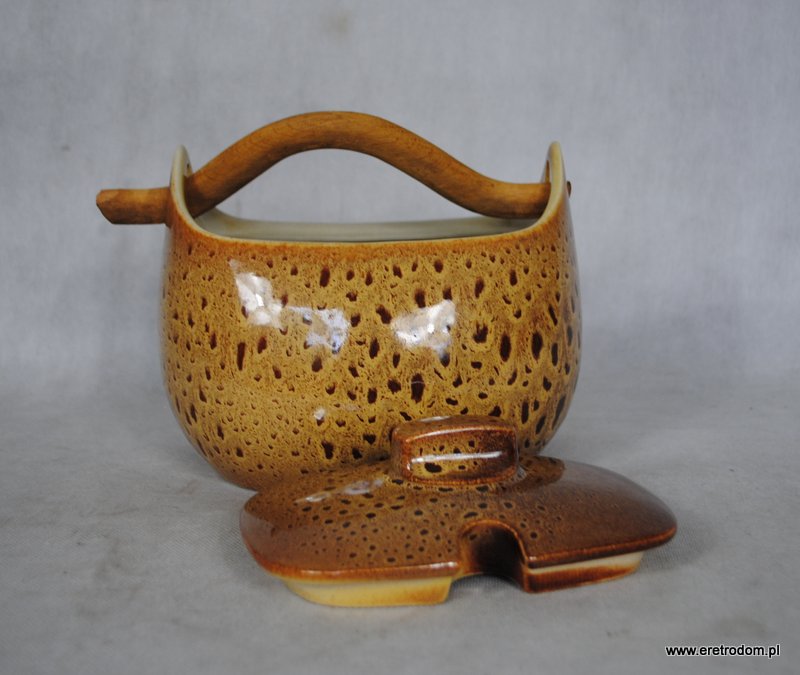 Bigośnica wyprodukowana w Mirostowickich Zakładach Ceramicznych. Porcelit szkliwiony w typowy dla wytwórni spodów. Rączka drewniana.