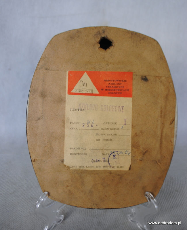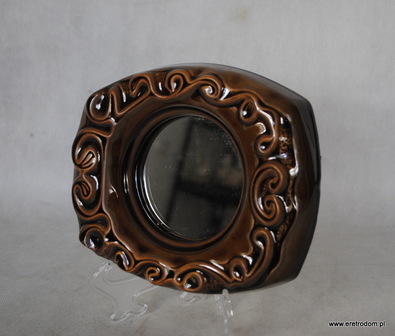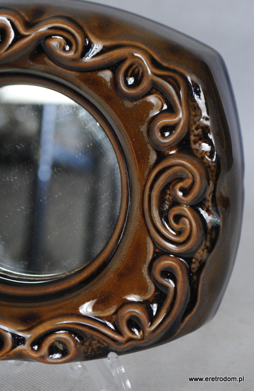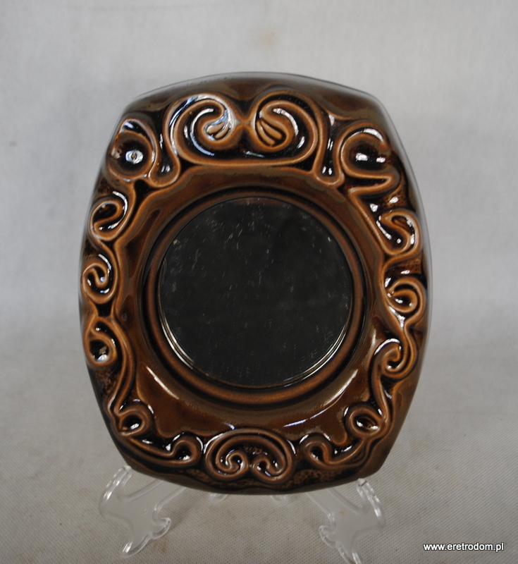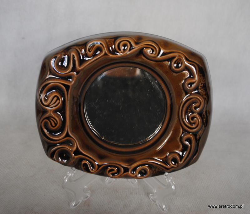 Lustro sygnowane Mirostowice. Model W-2. Ceramika szkliwiona na brązowy kolor. W tylnej części oryginalna naklejka producenta. Do powieszenia.