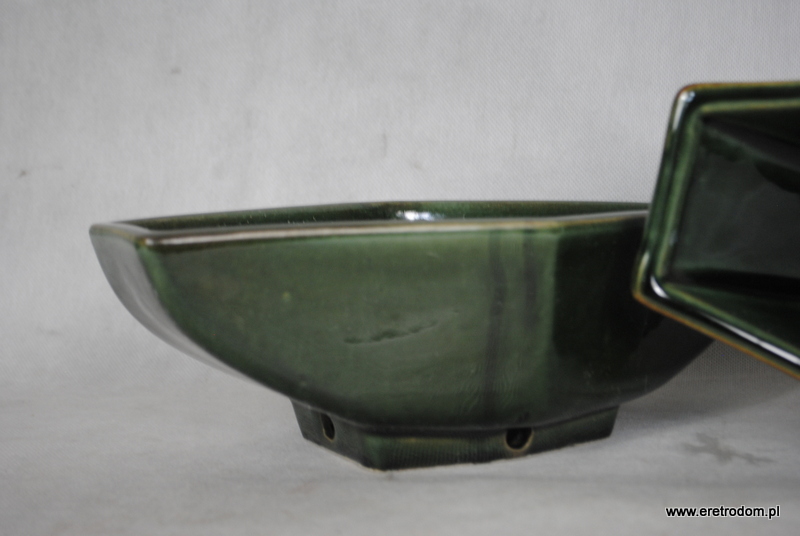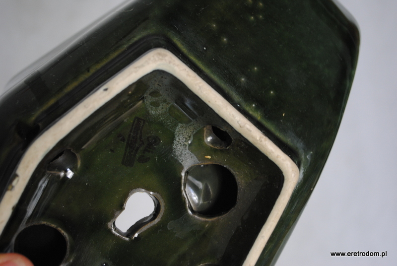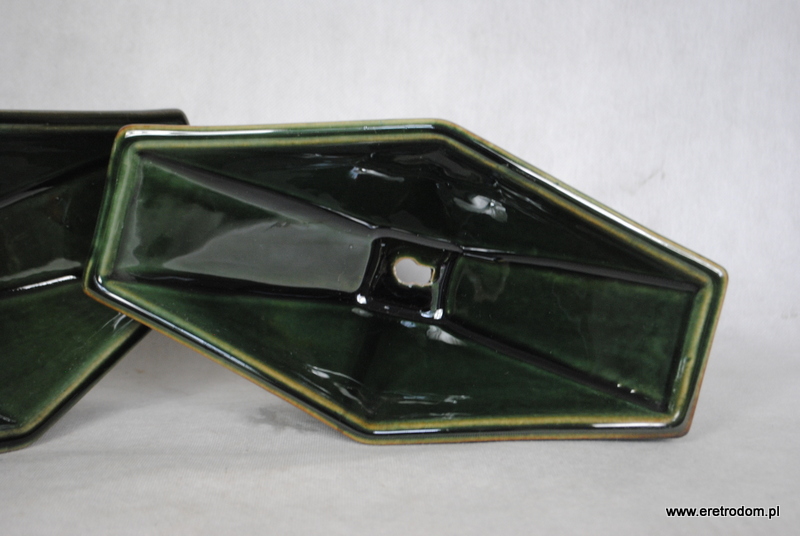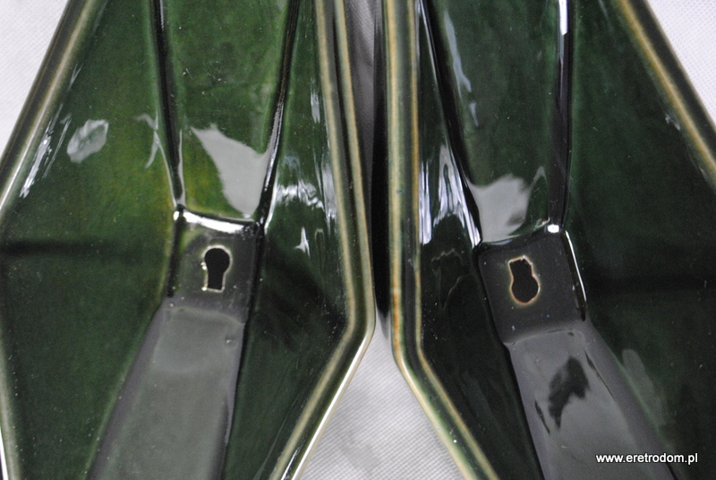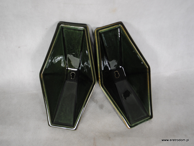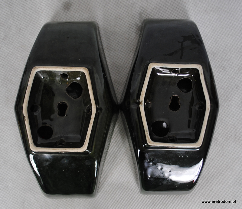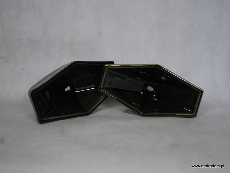 Dwie oprawy P12/OK-213 sygnowanych Mirostowice. Porcelit szkliwiony na ciemno zielony kolor. W tylnej części sygnatura producenta. Piękna prosta forma