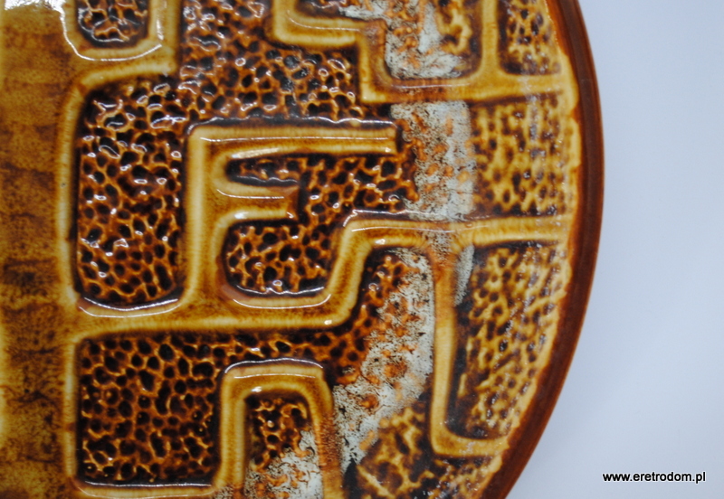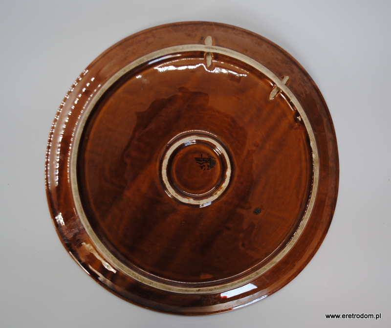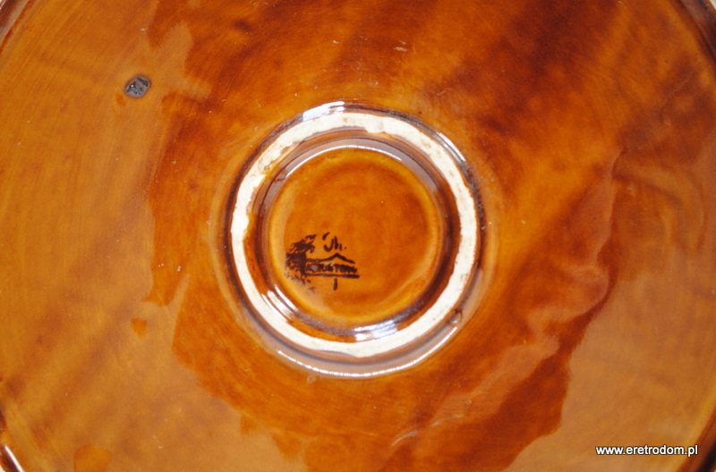 Patera sygnowana Mirostowice. Ceramika szkliwiona, w centralnej części widnieje geometryczny wzór przypominający drzewo.