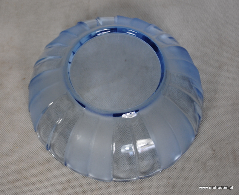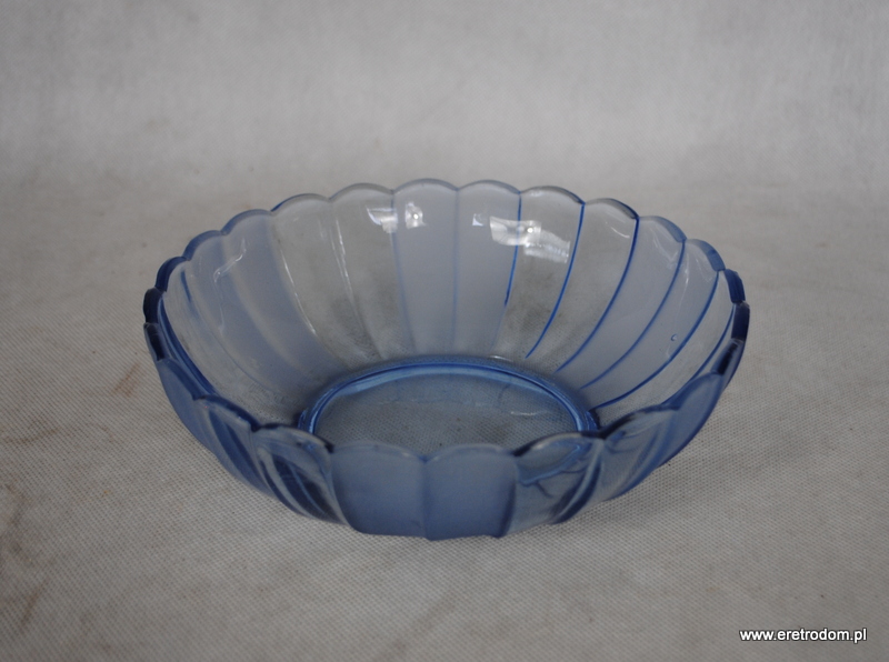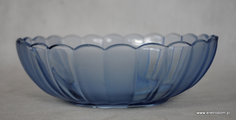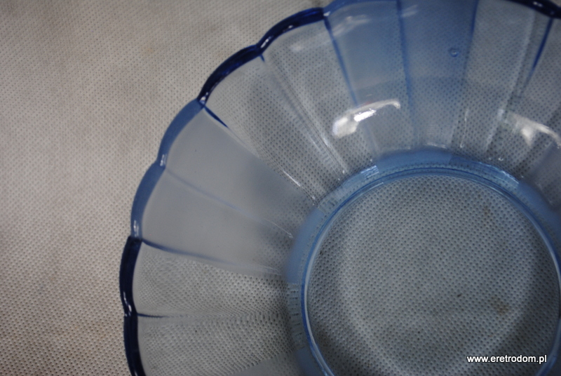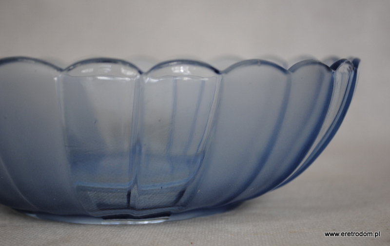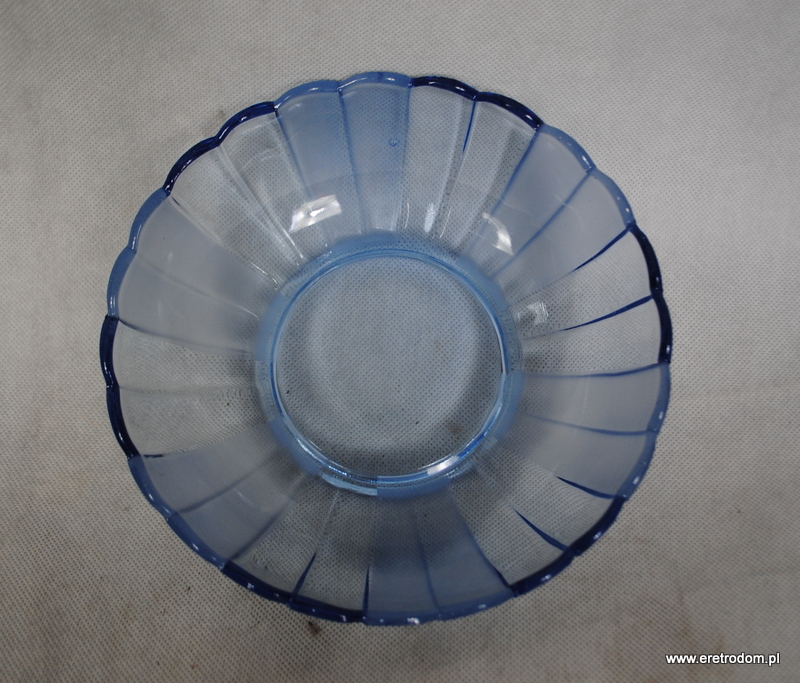 Salaterka czy też miska. Szkło prasowane, barwione w masie na błękitny kolor. Częściowo trawiona.