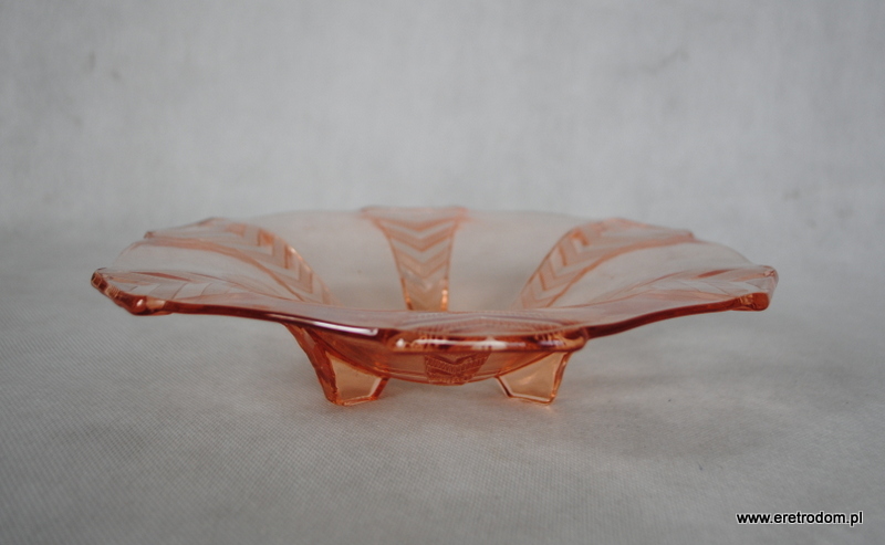 Misa, patera wykonana ze szkła prasowanego barwionego w masie. Szkło częściowo zmatowione. Całość na trzech nóżkach, utrzymana w stylu Art Deco.