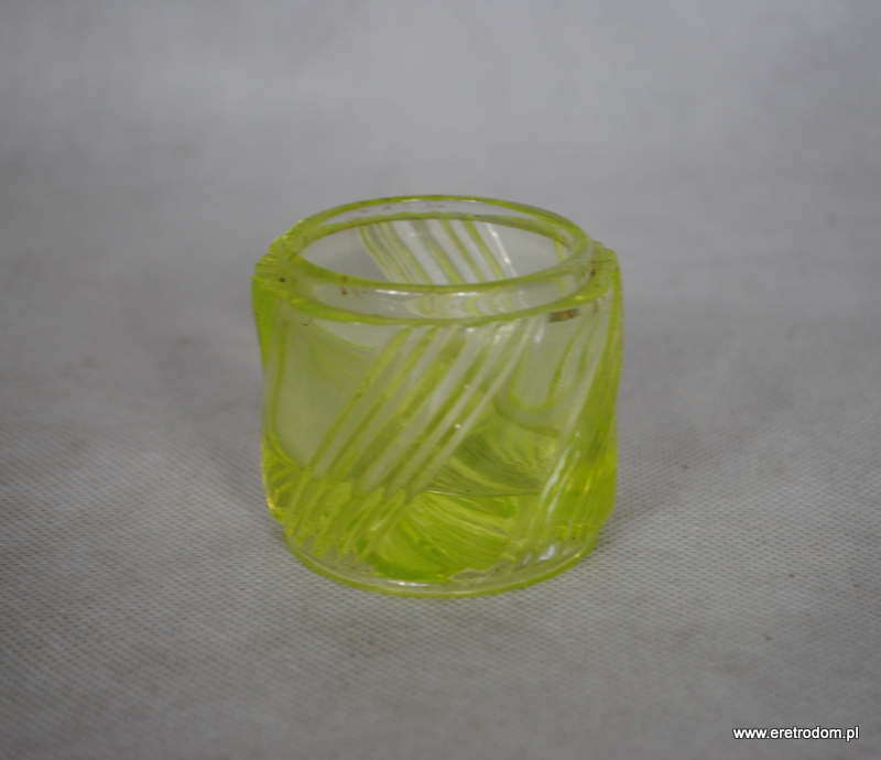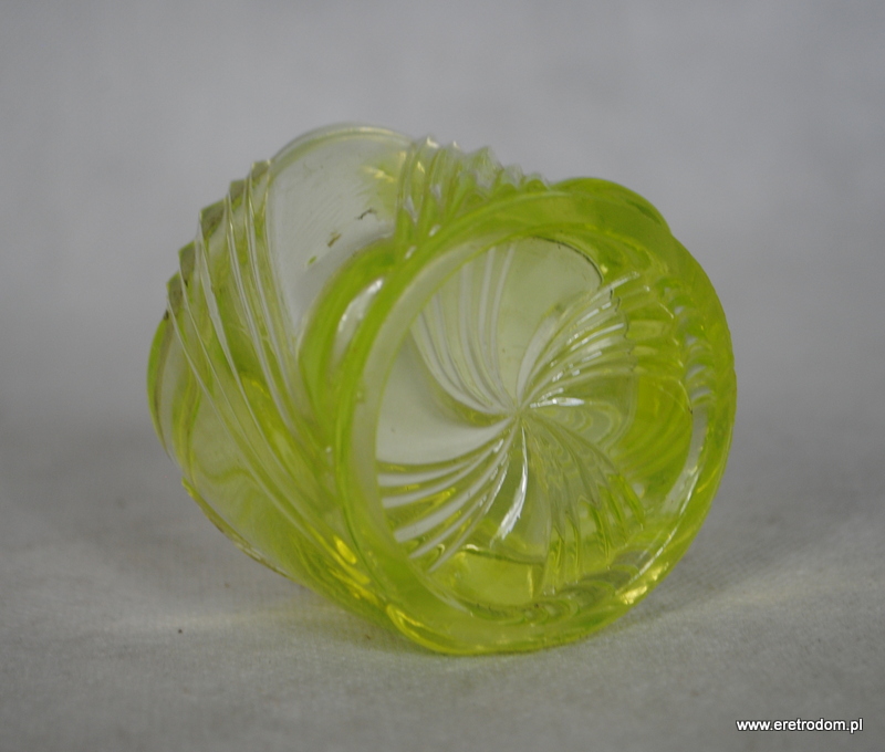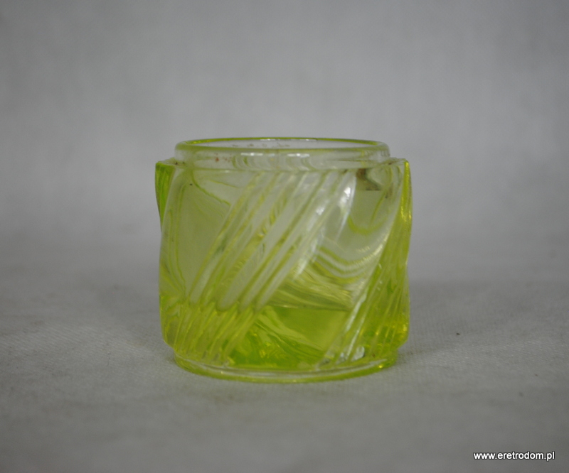 Pojemnik wykonany w I poł XXw. Szkło prasowane, uranowe. Najprawdopodobniej kiedyś miał przykrywkę.