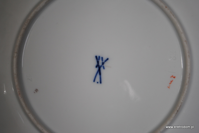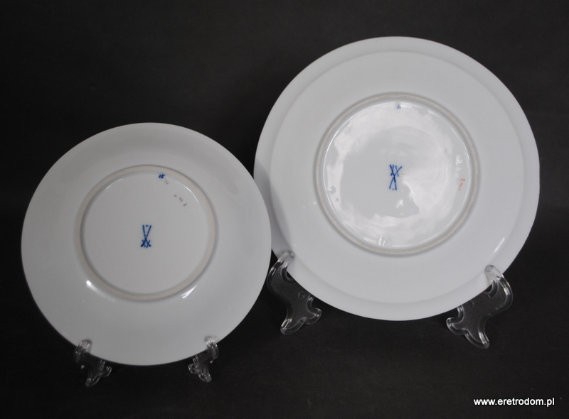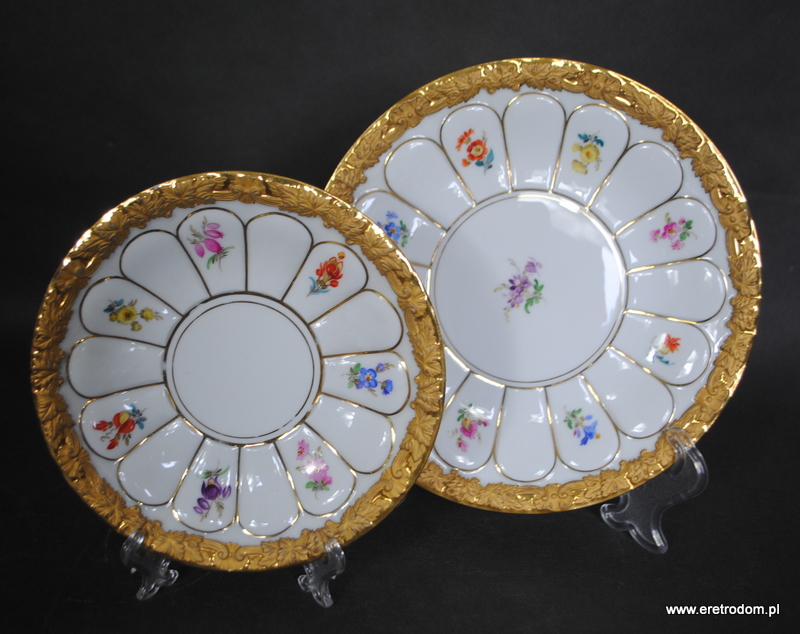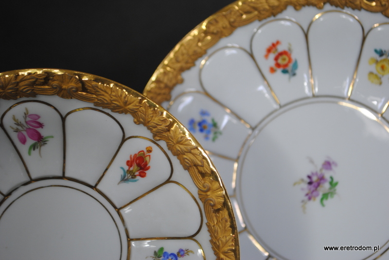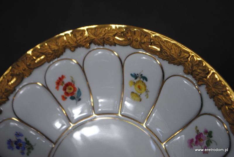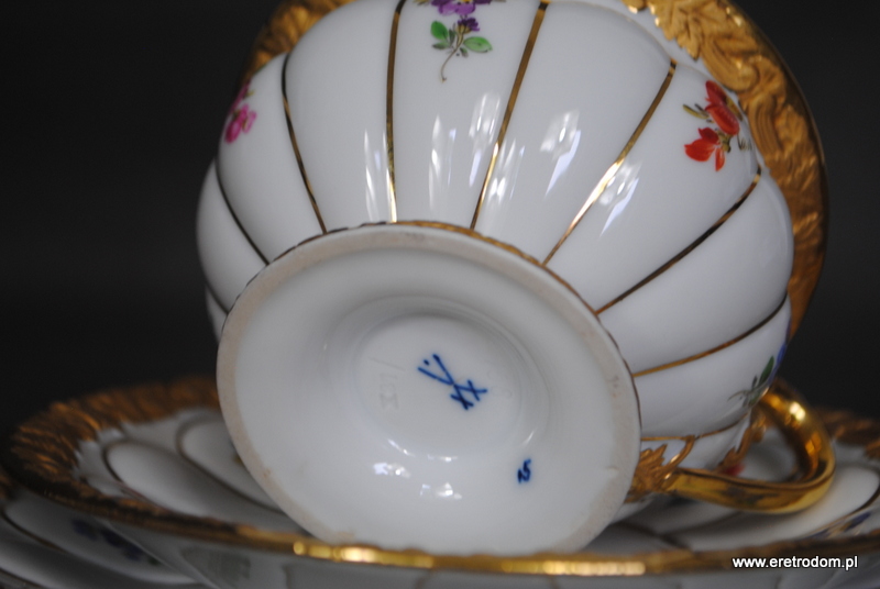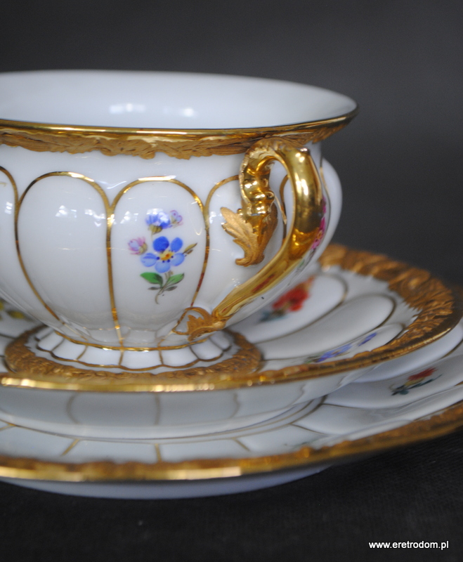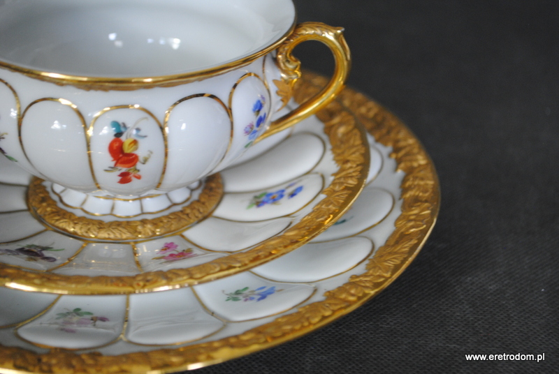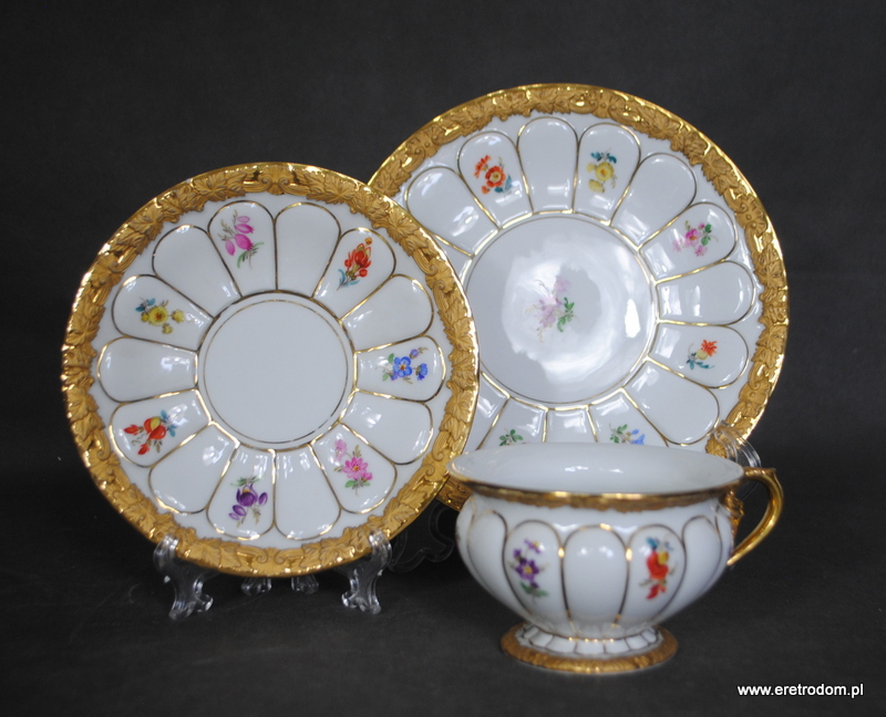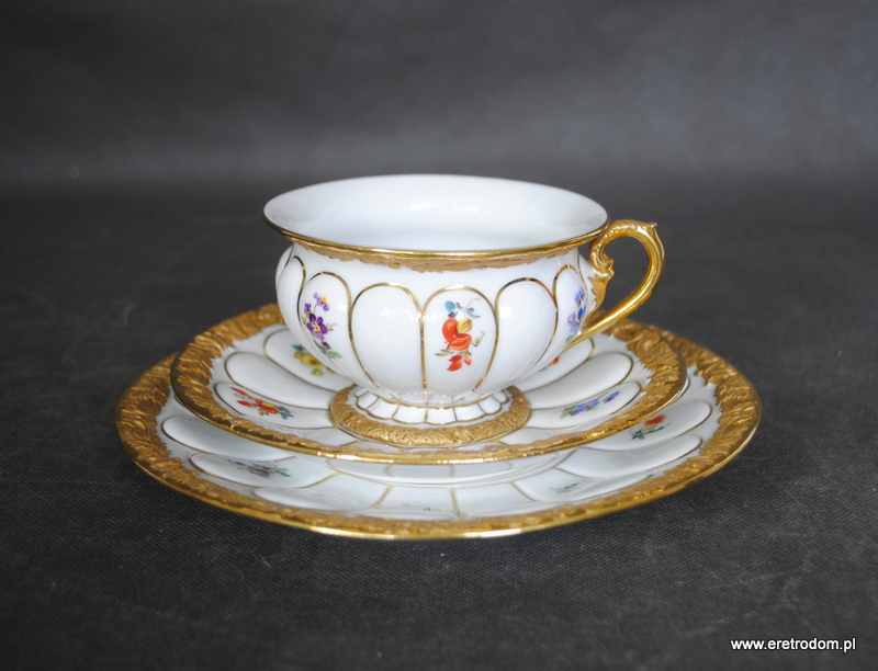 Trio czyli filiżanka, spodek oraz talerzyk deserowy. Sygnowane Miśnia ( II poł. XXw.). Biała porcelana, ręcznie malowana w motywy kwiatowe, bogato złocona. Piękne wykonanie.