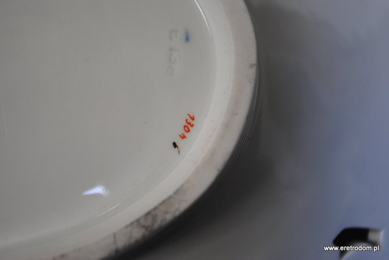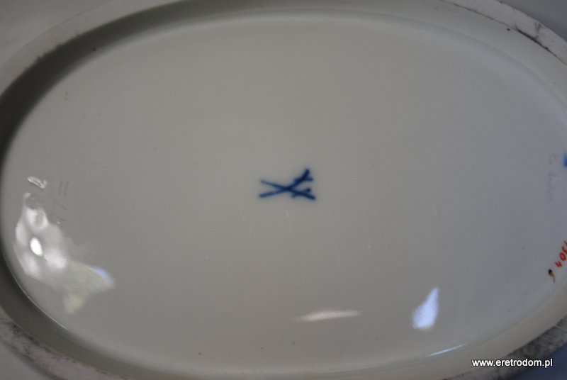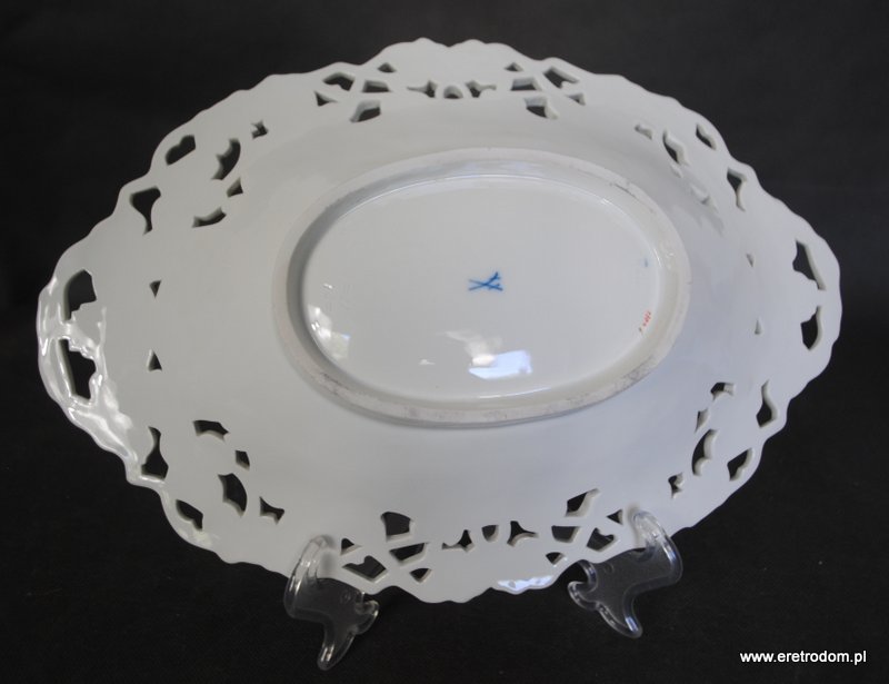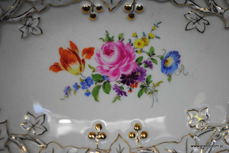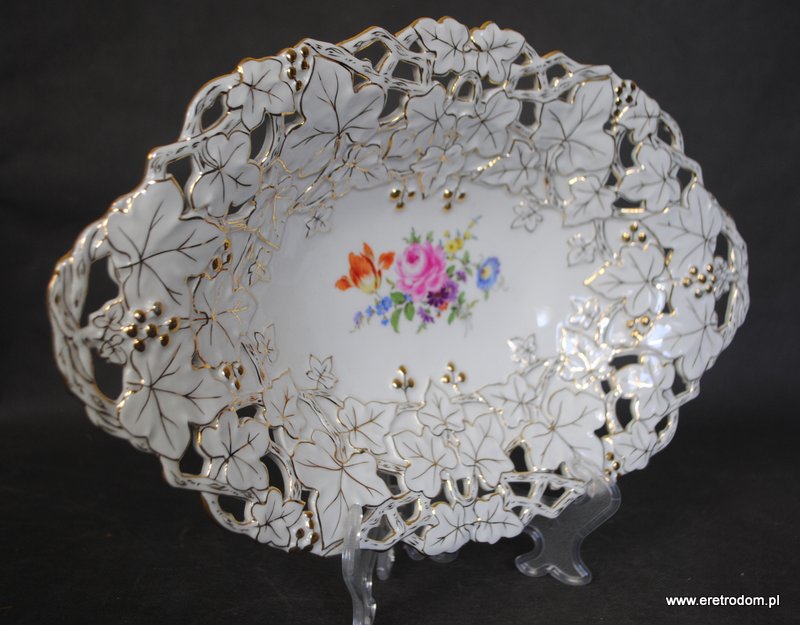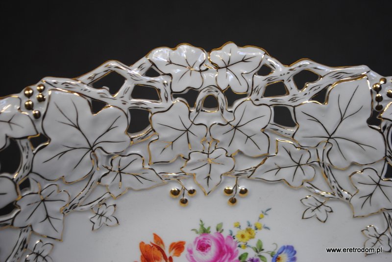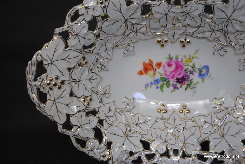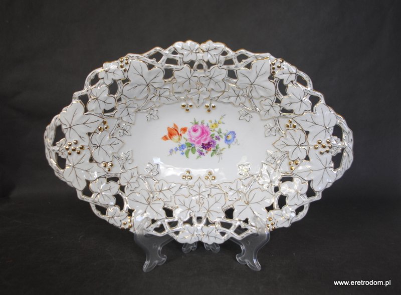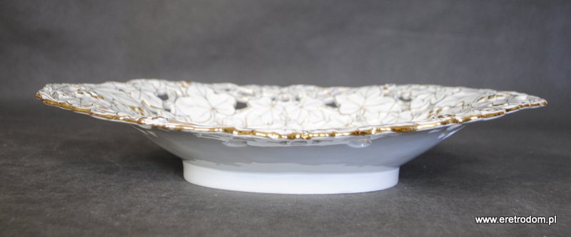 Patera sygnowana Miśnia. Biała porcelana, złocona. W centralnej części motyw kwiatowy.