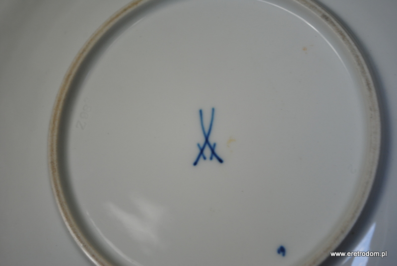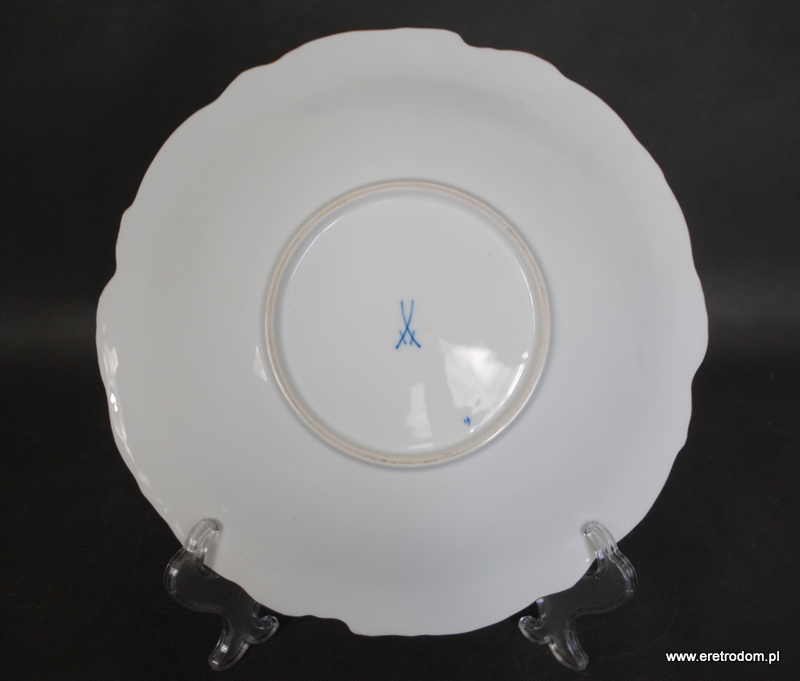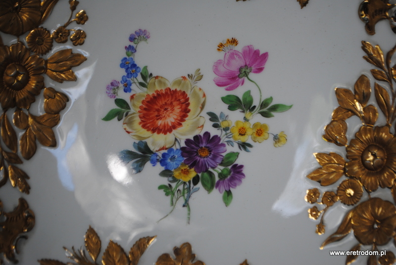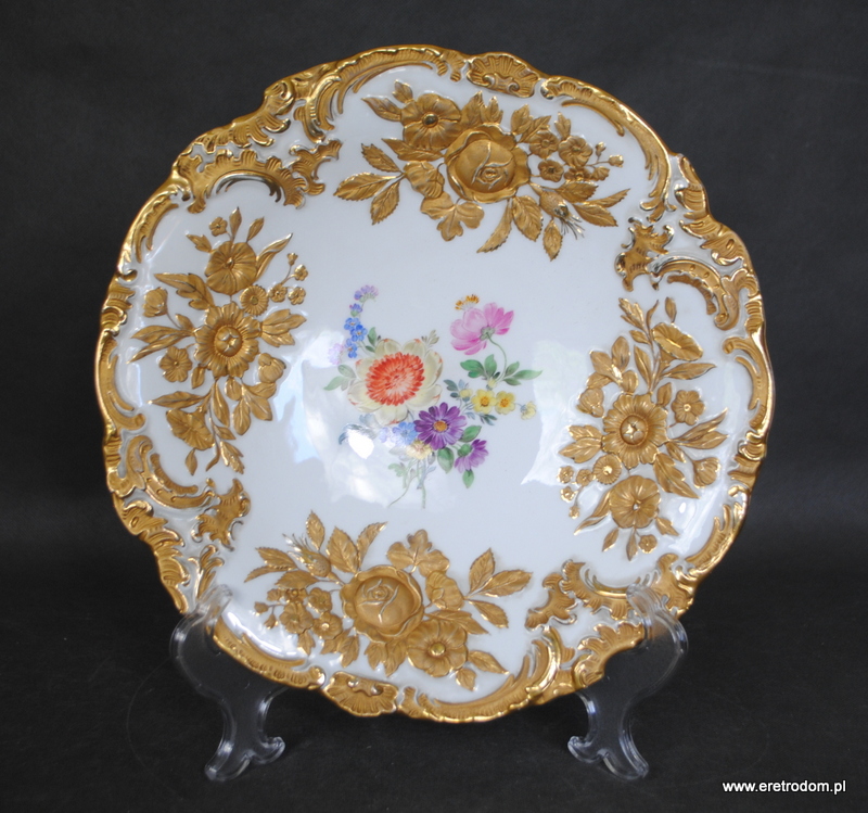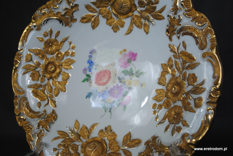 Patera czy też talerz dekoracyjny sygnowana Meissen (Miśnia, sygnatura z II połowy XX w. ). Biała porcelana najwyższej jakości tłoczona w motywy roślinne, złocona. W centralnej części malowane kwiaty.