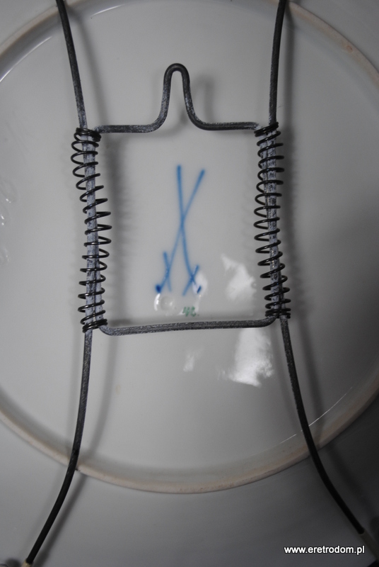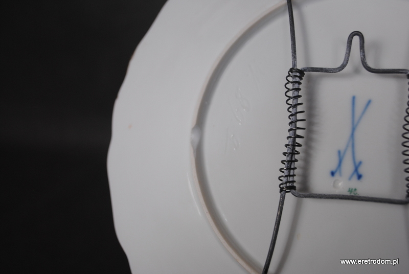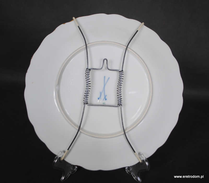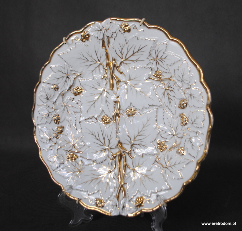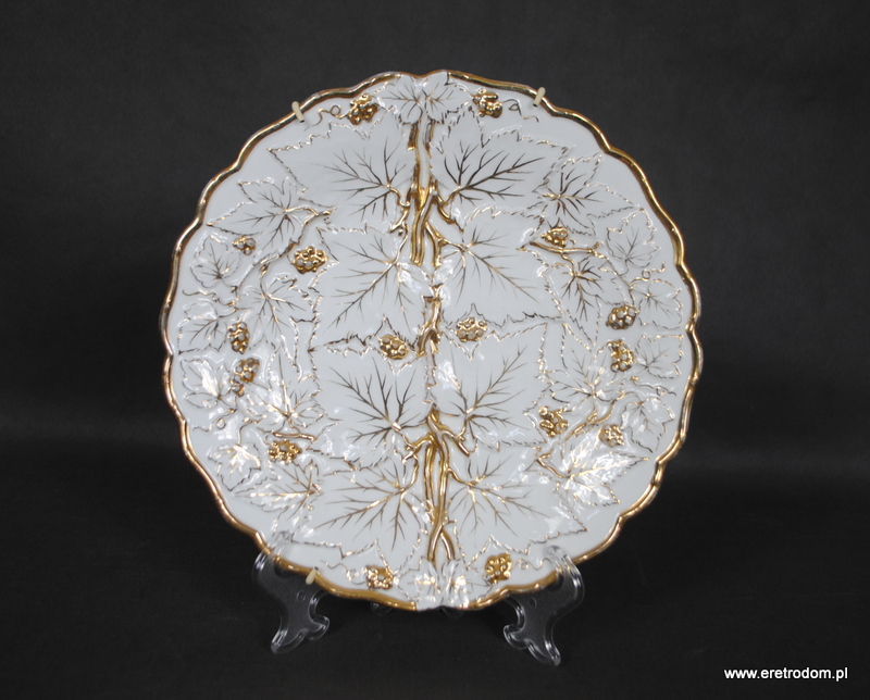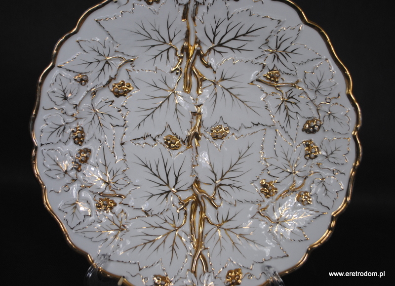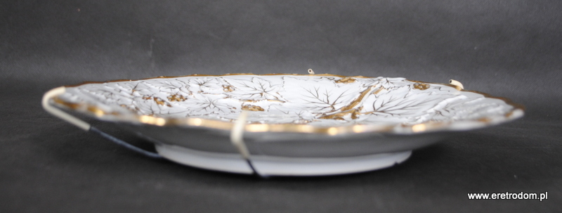 Patera czy też talerz dekoracyjny sygnowana Meissen (Miśnia, sygnatura z połowy XIX w. ). Biała porcelana najwyższej jakości tłoczona w motywy liści, złocona. W tylnej części posiada sygnaturę.