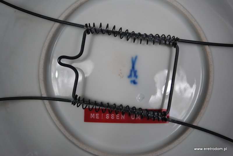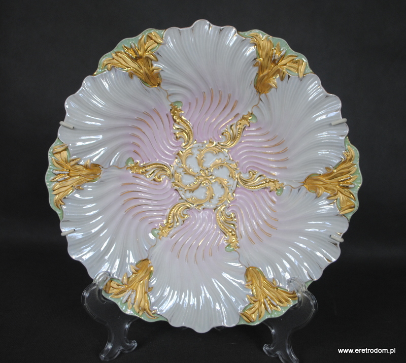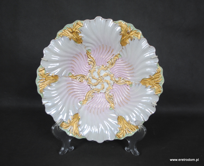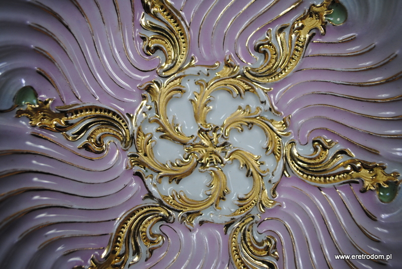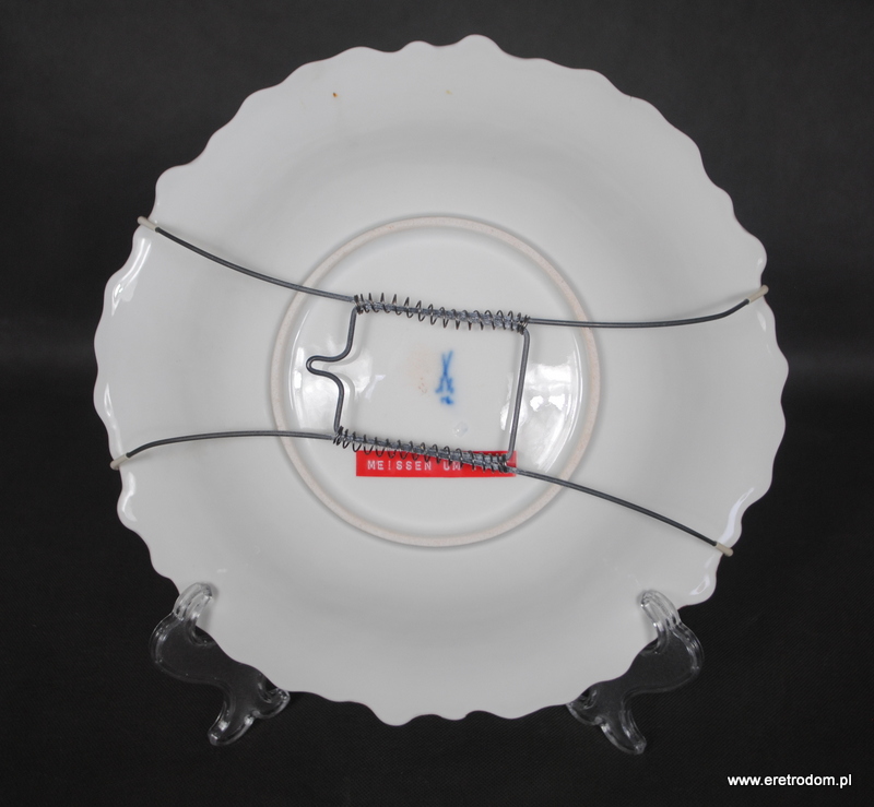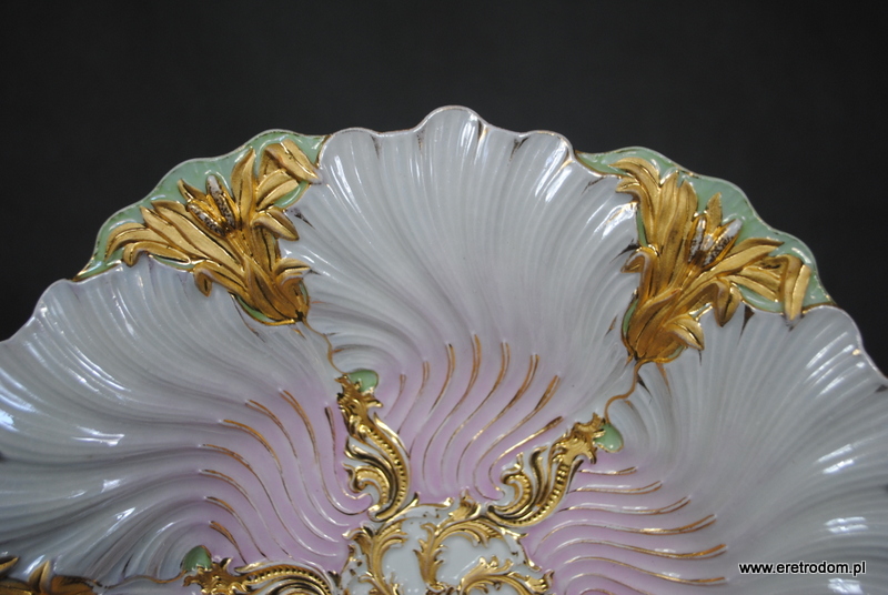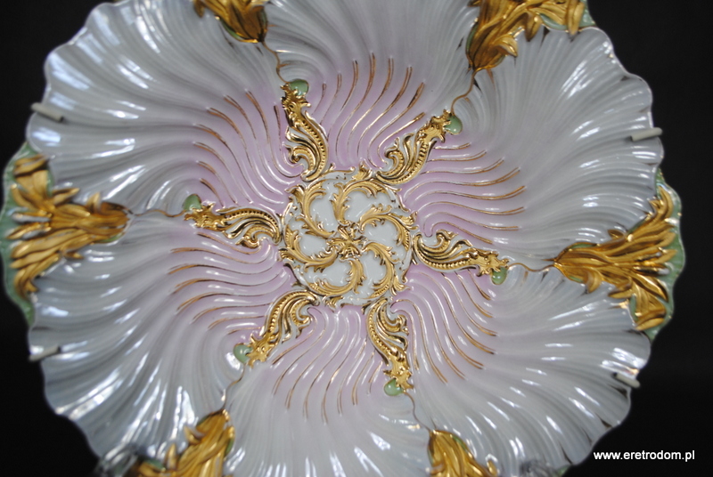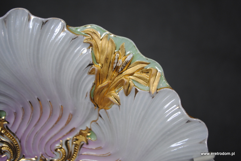 Patera czy też talerz dekoracyjny sygnowana Meissen (Miśnia, 1924-1934r ). Biała, delikatna porcelana najwyższej jakości malowana na kolor pudrowego różu i mięty, złocona. W tylnej części posiada sygnaturę oraz czerwoną naklejkę z napisem „Meissen um 1815”.