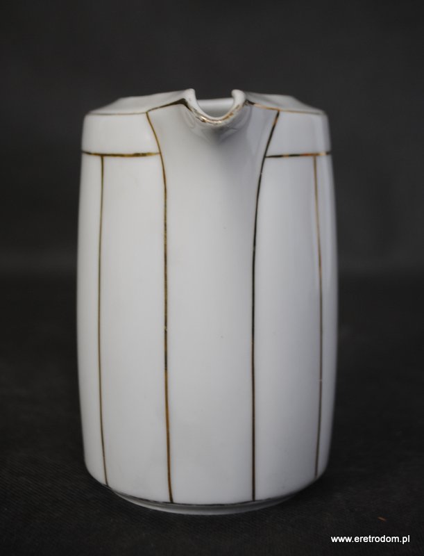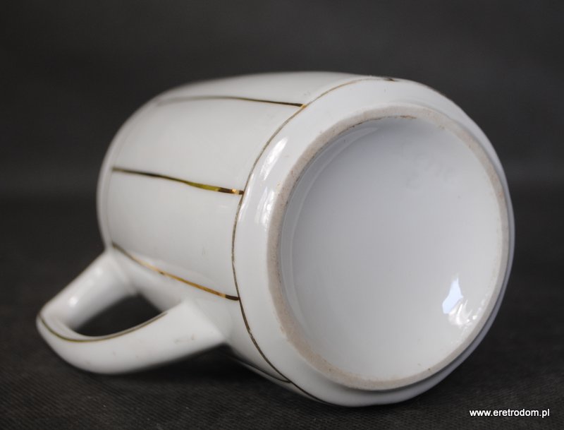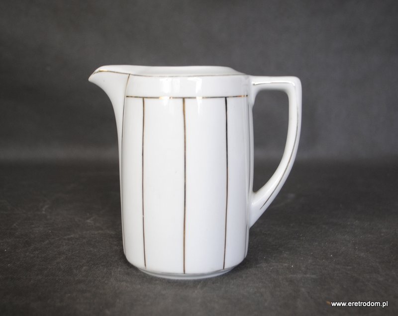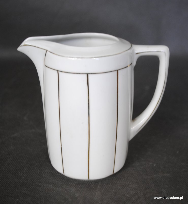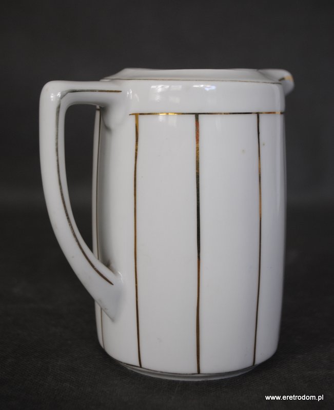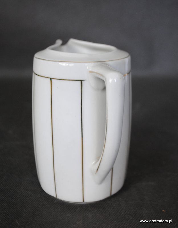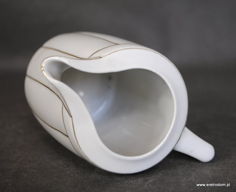Mlecznik, I poł XXw. Biała, delikatna porcelana malowana w złote pasy.