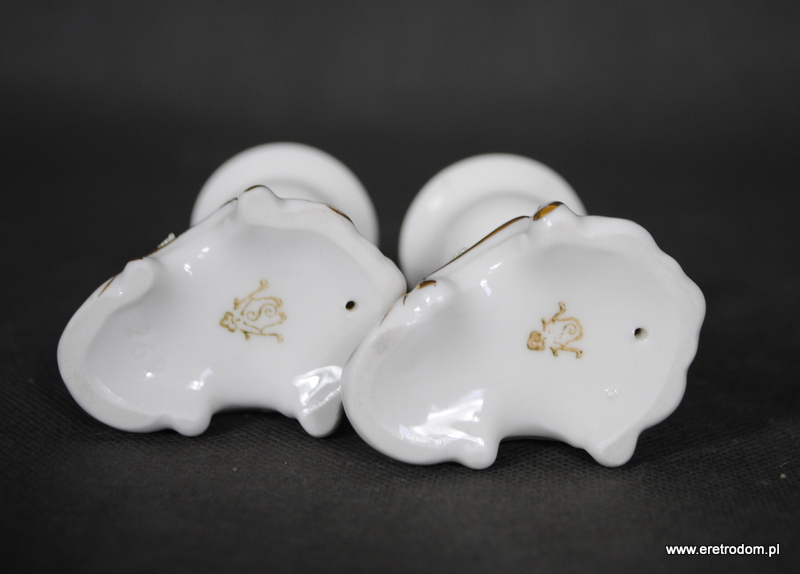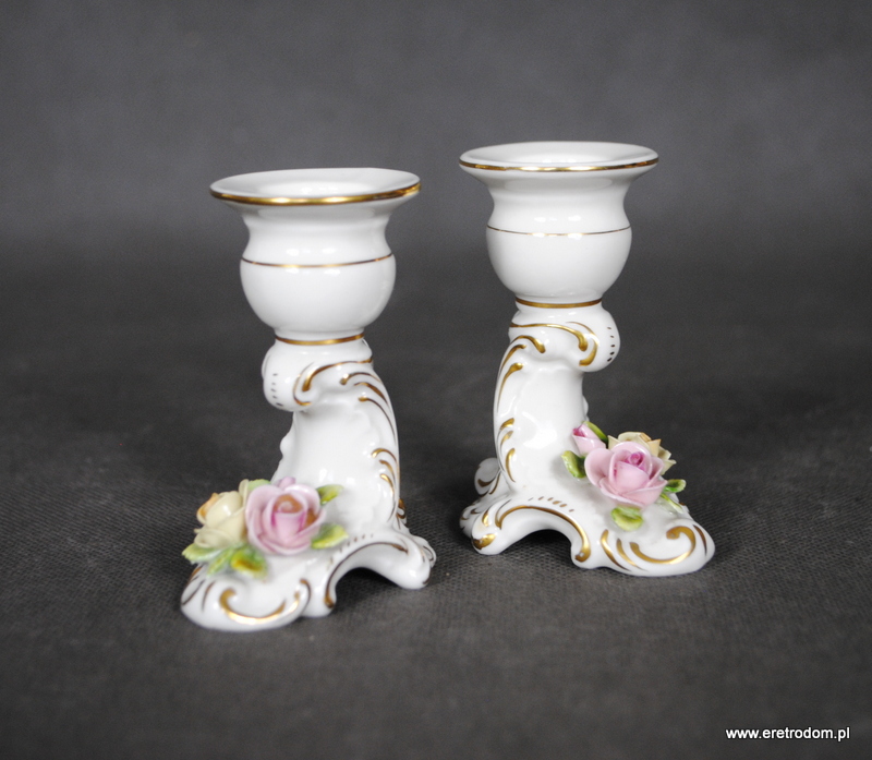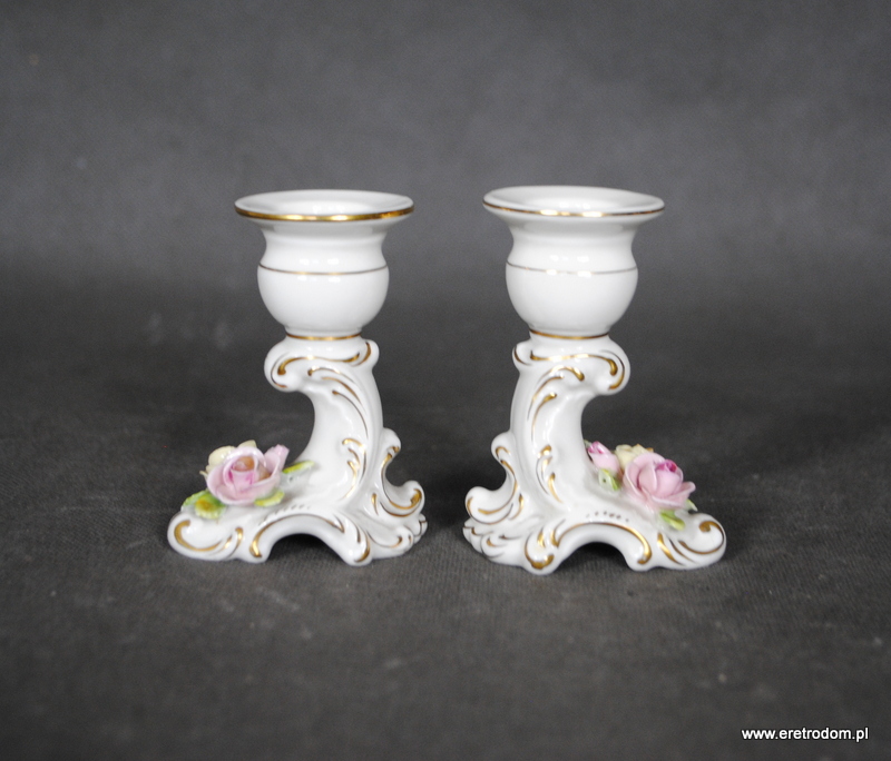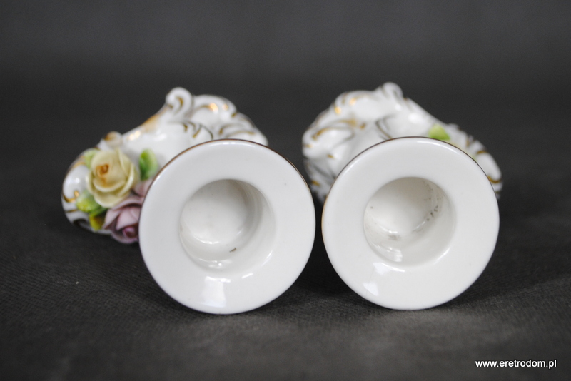 Para świeczników sygnowana Rudolstadt Volkstedt (Niemcy). Porcelana w kolorze złamanej bieli ozdobiona plastycznymi kwiatuszkami, złocona.