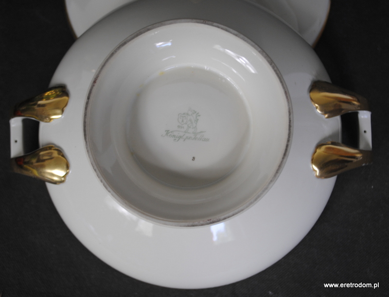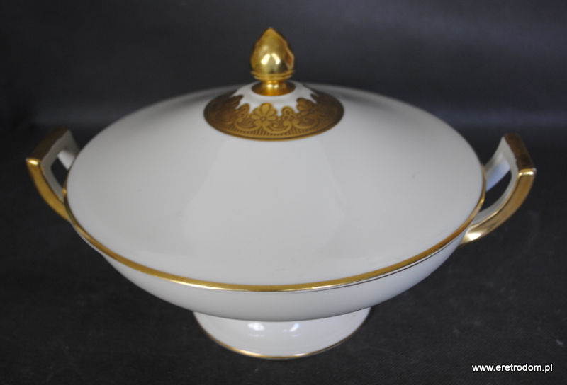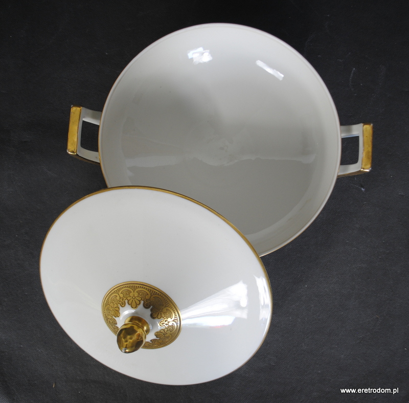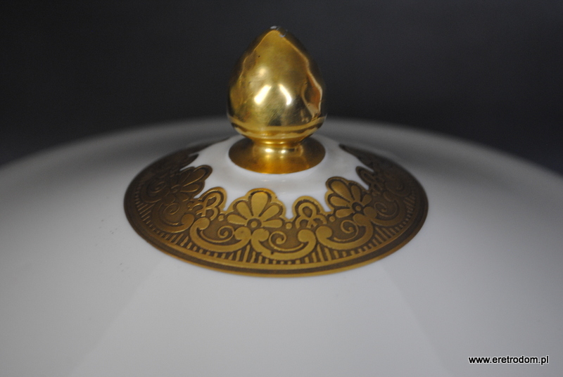 Waza sygnowana Tettau (Niemcy, II poł. XXw.). Dobrej jakości porcelana w kolorze ecru, pięknie złocona.