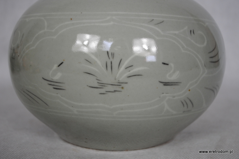 Wazon w obłym kształcie, sygnowany (wschód?). Ceramika w miętowym kolorze. Subtelnie dekorowana białymi szlaczkami.