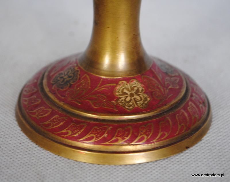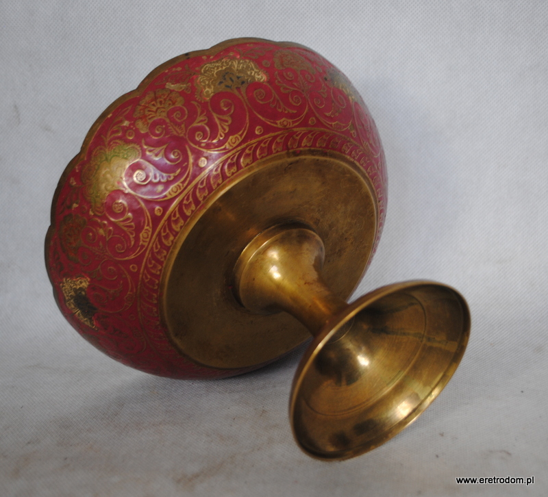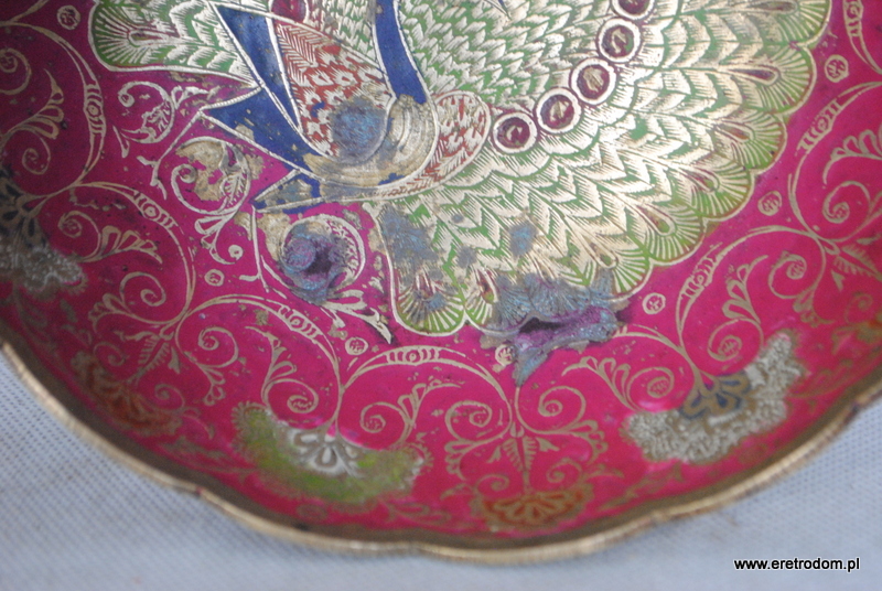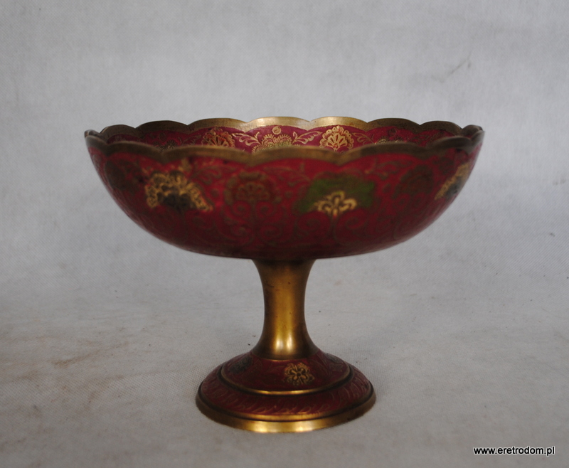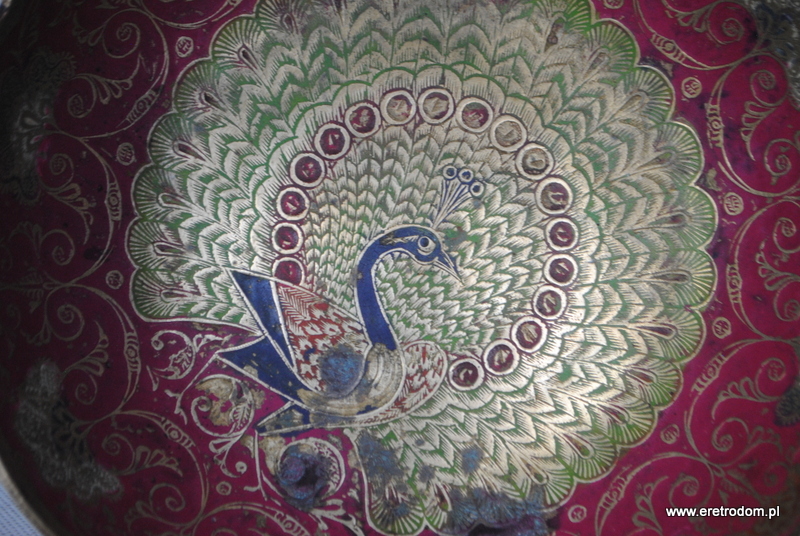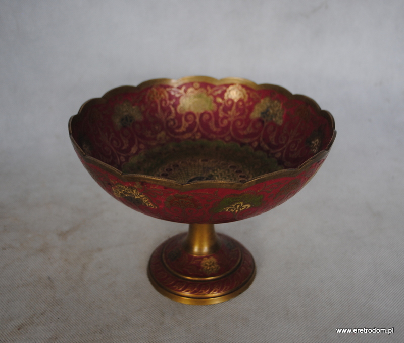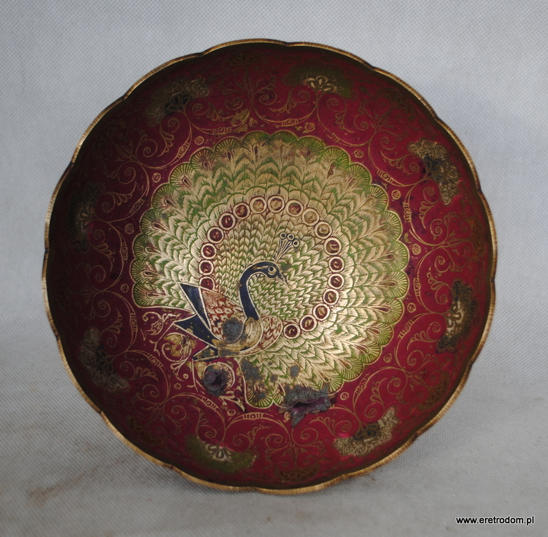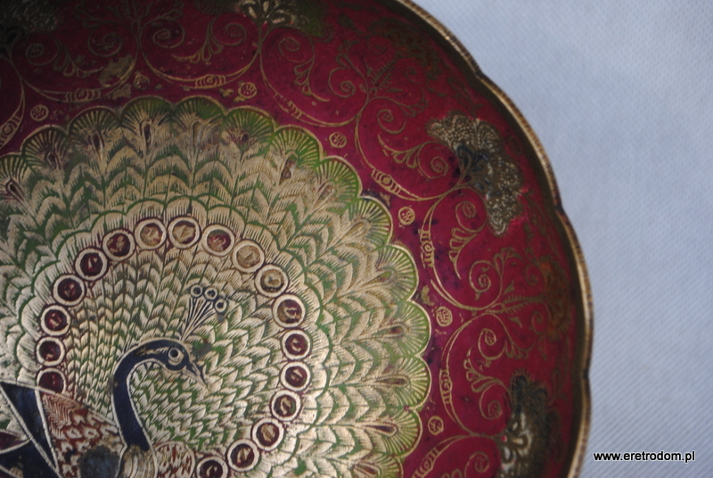 Owocarka czy też patera na nodze. Azjatycka produkcja. Mosiądz ozdobiony motywem pawia. Podmalowany na odcienie czerwieni i niebieskiego.