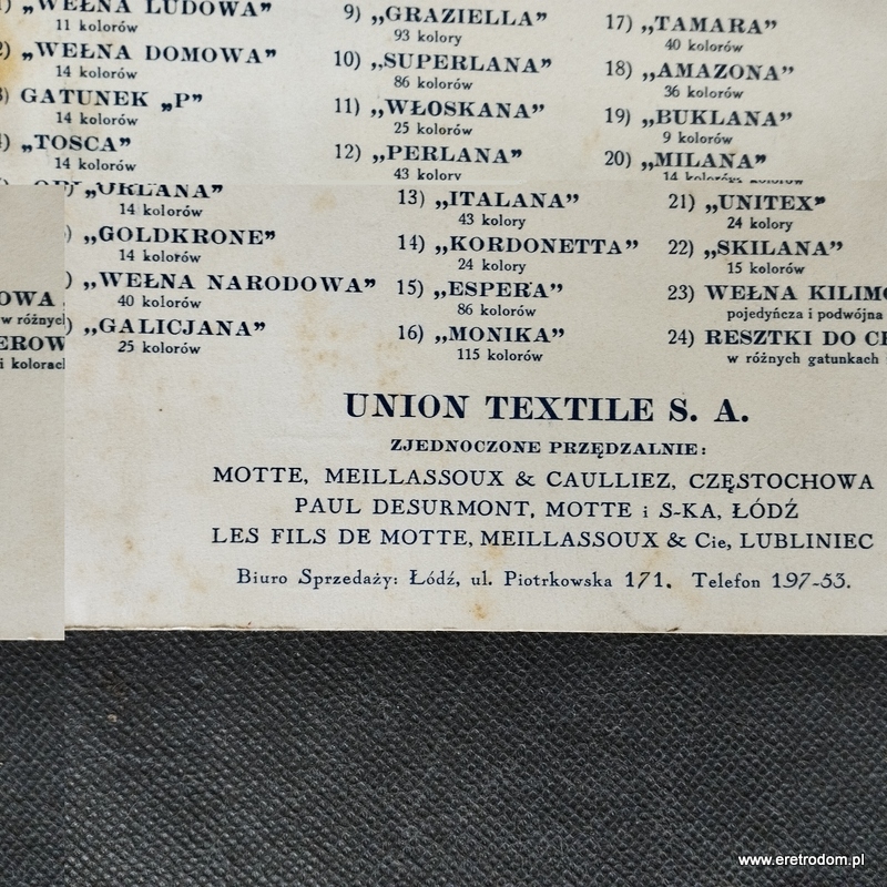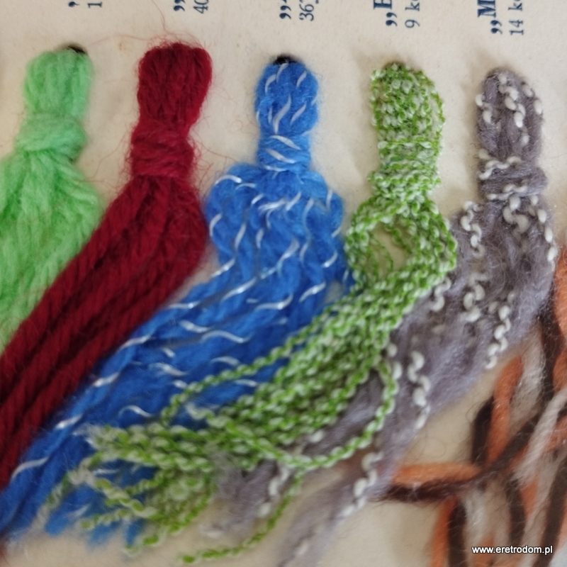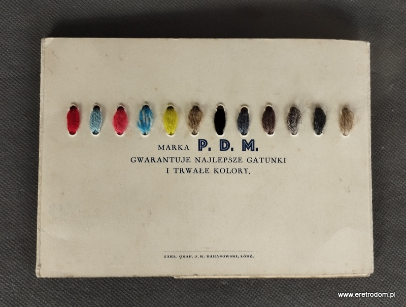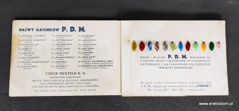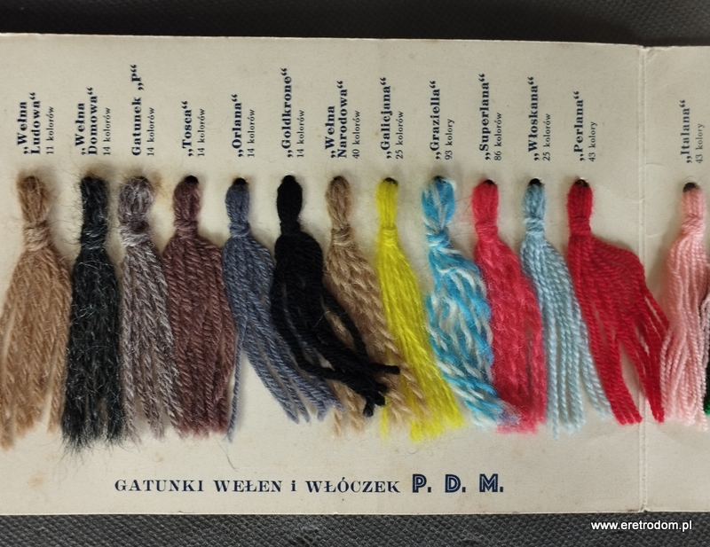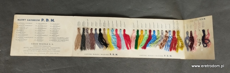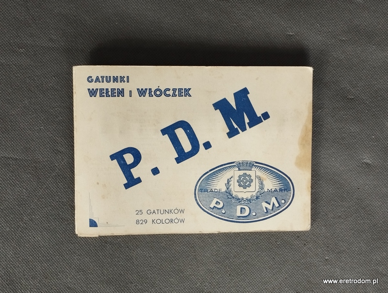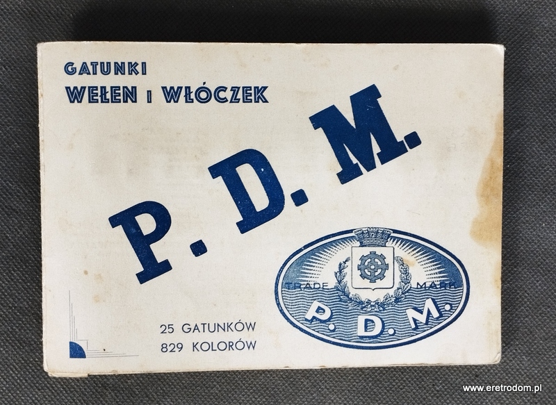 Próbnik gatunków wełn i włóczek z firmy P.D.M. Łódź. Twardsza oprawa, w środku świetnie zachowane wełny i włóczki. Oryginał.