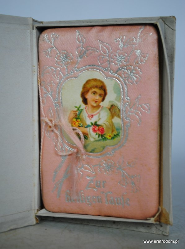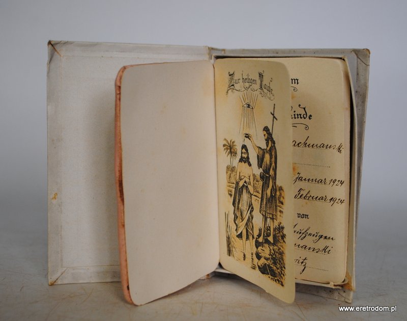 Tekturowa pamiątka z Chrztu Świętego, Katowice, 1924 rok. W środku odręczne wypisy.