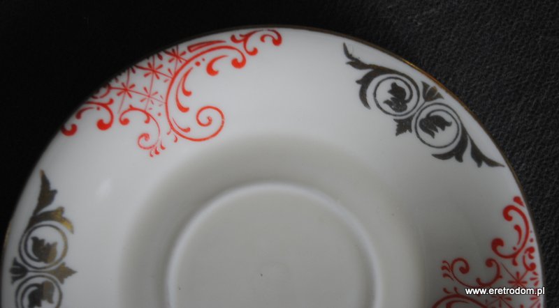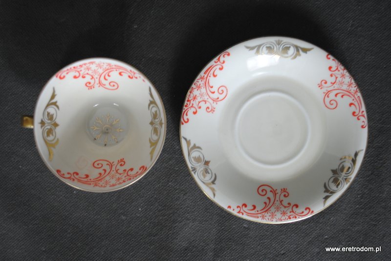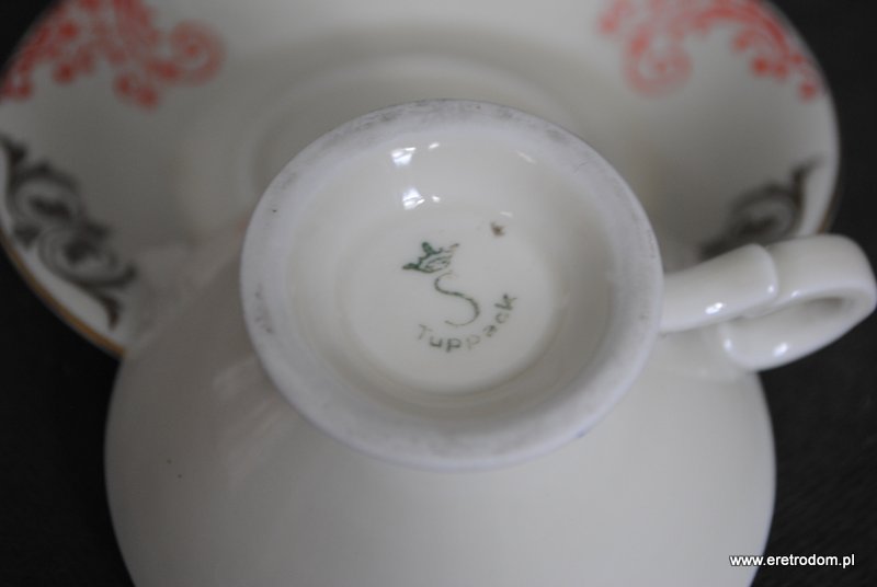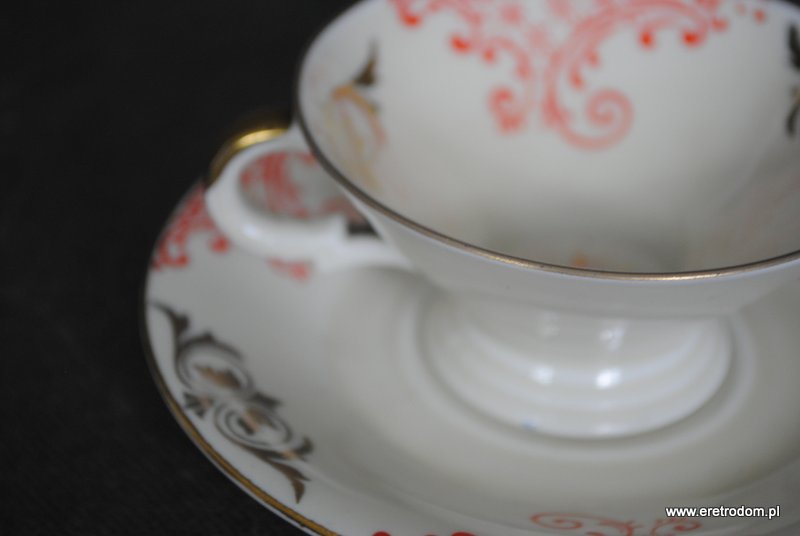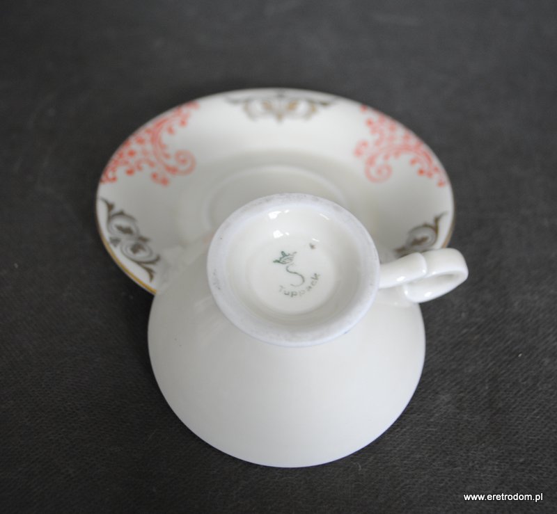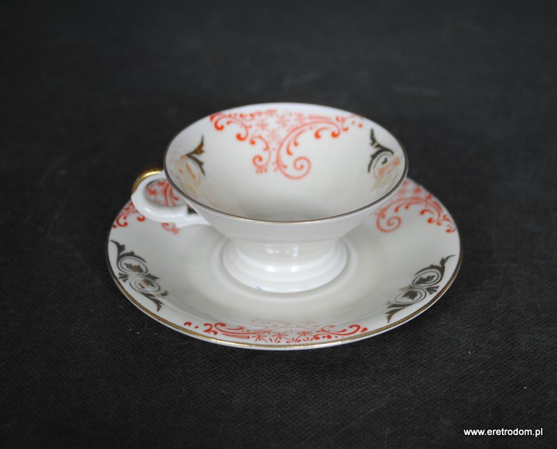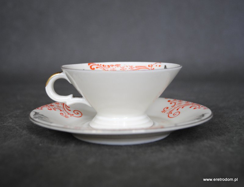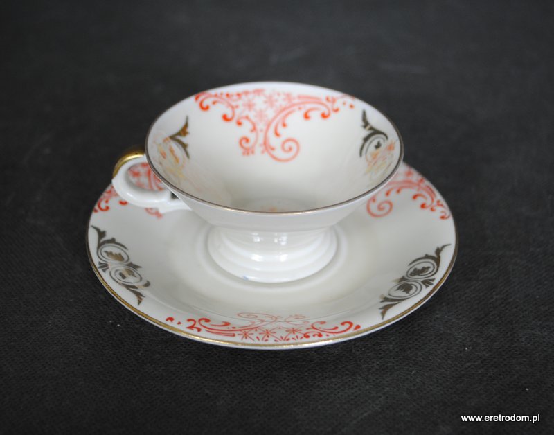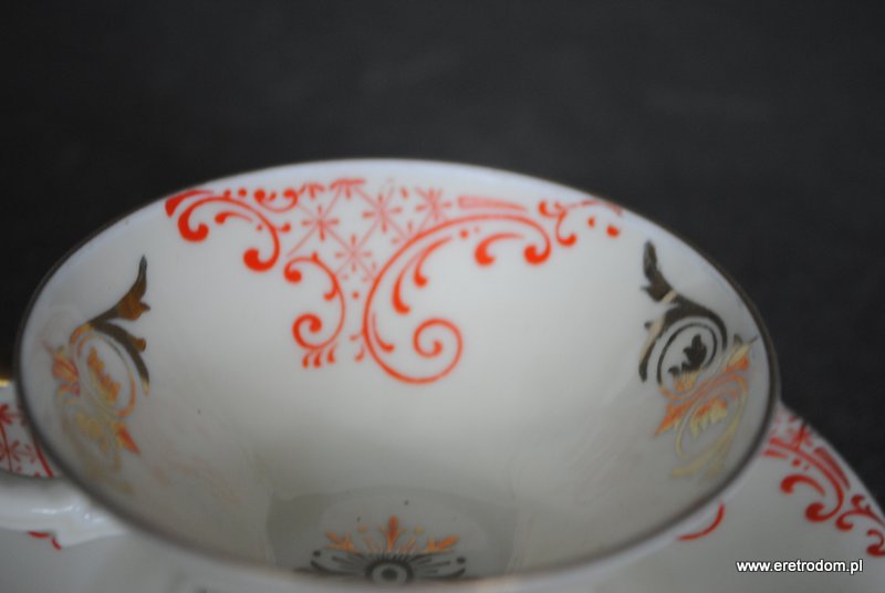 Filiżanka ze spodkiem, produkcja Parowa Tuppack (sygnatura z lat 1929-1945). Cienka porcelana w kolorze ecru zdobiona pomarańczowym szlaczkiem oraz złocona.