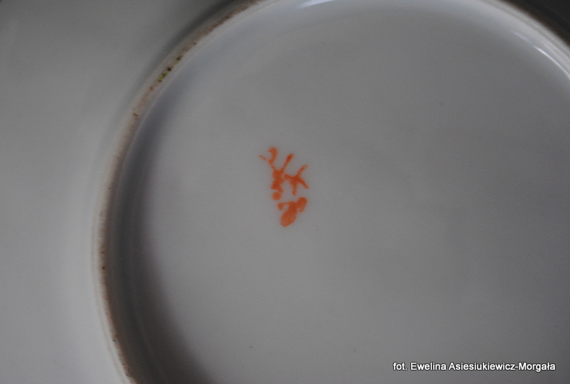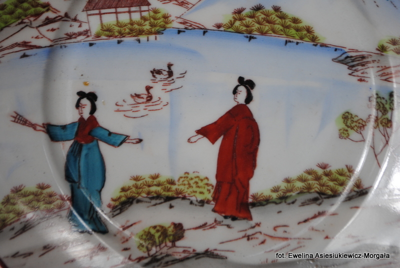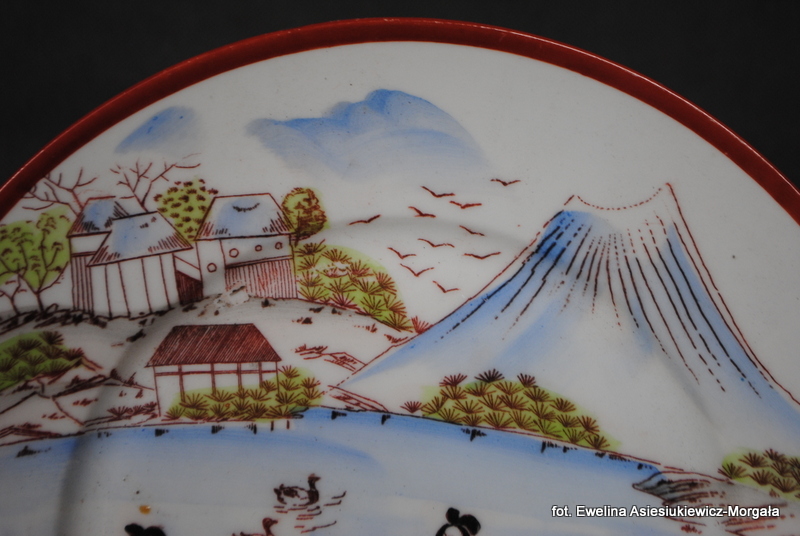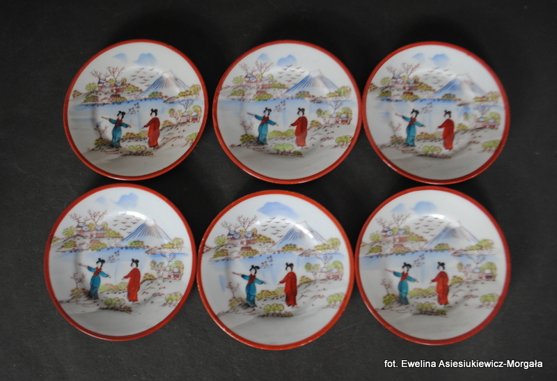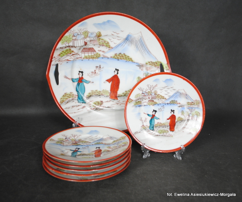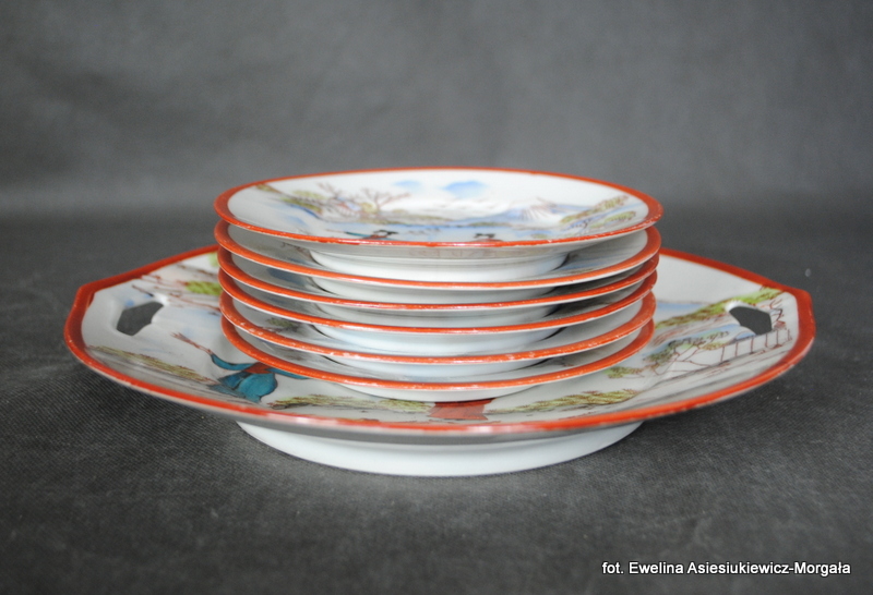 Zestaw do ciasta sygnowane Parowa Tuppack, I poł. XXw. (1925-1945). Porcelana ręcznie malowana w orientalnym stylu. W skład zestawu wchodzi patera na ciasto oraz 6 talerzyków deserowych.
