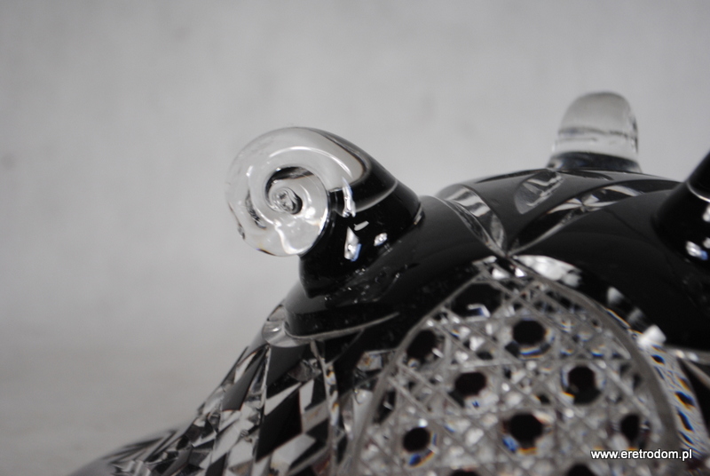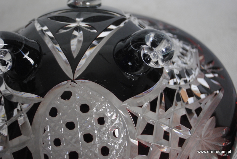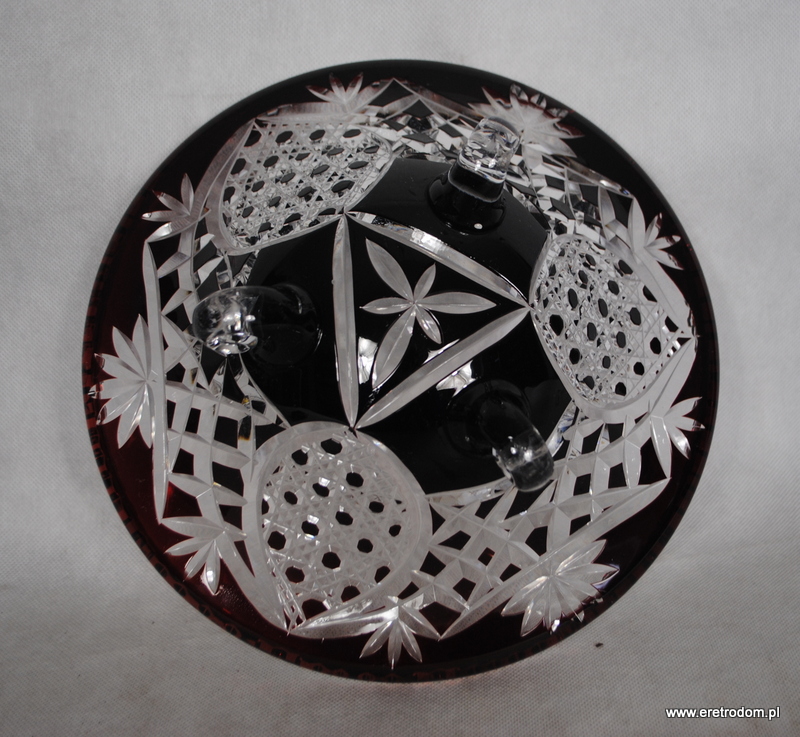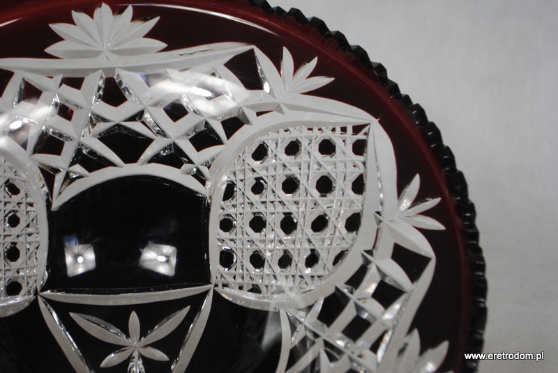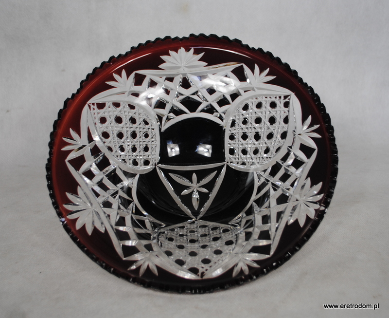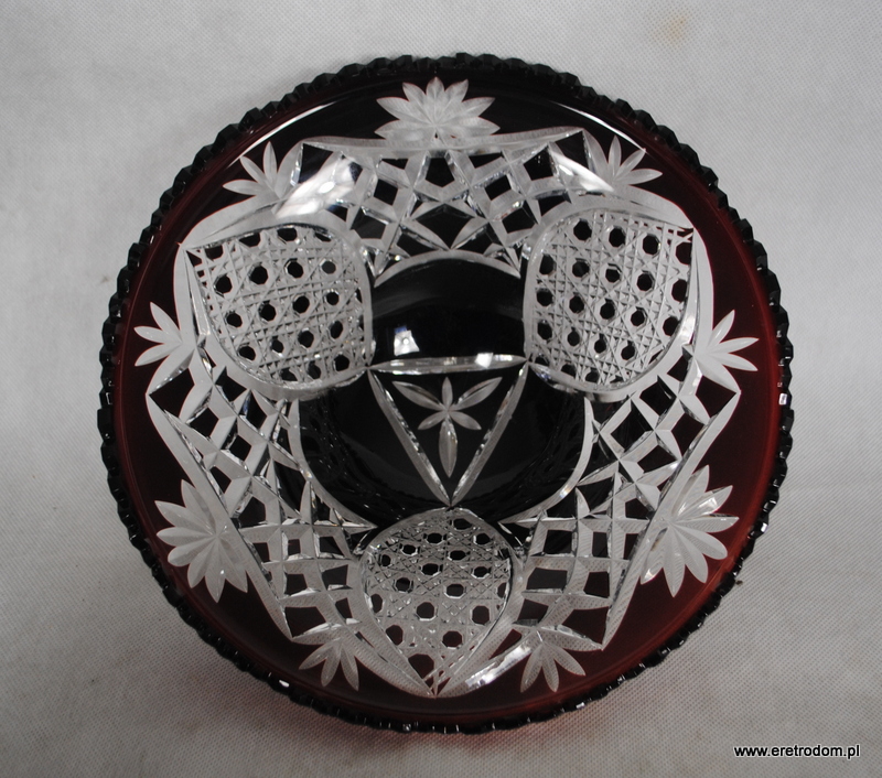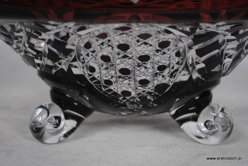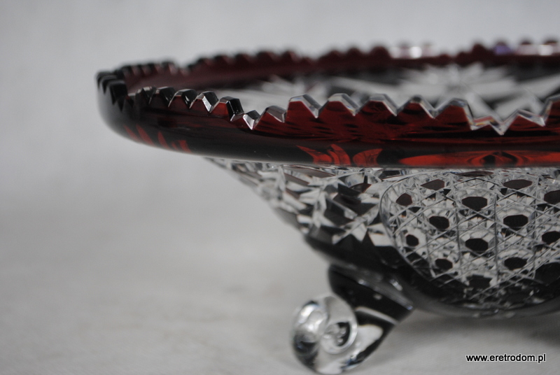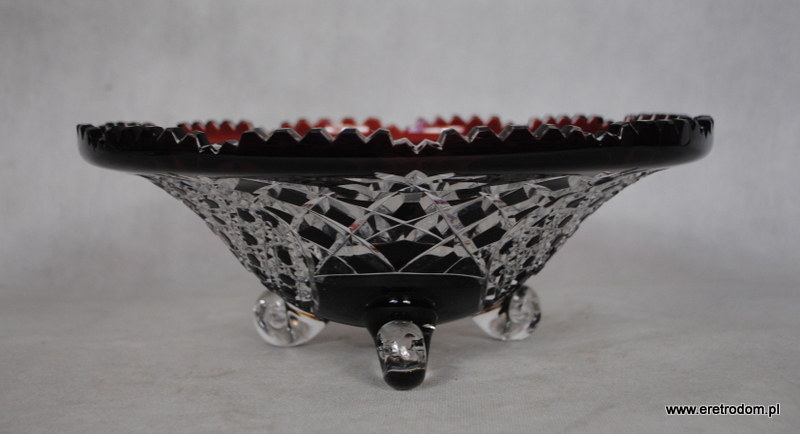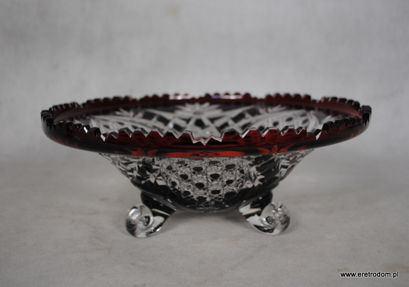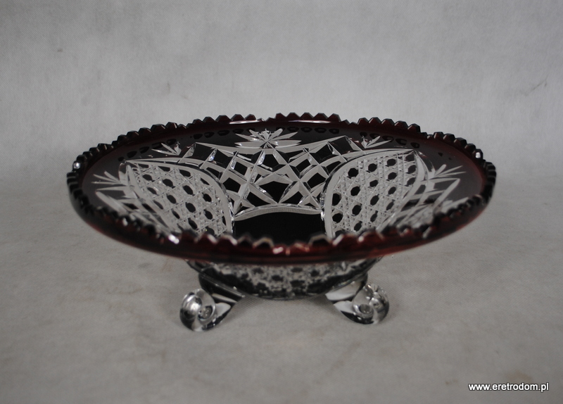 Stareńka patera wykonana z grubego czystego szkła. Lazurowana na bordowy kolor. Czasza osadzona na 3 zgrabnych nóżkach. Piękne wykonanie.